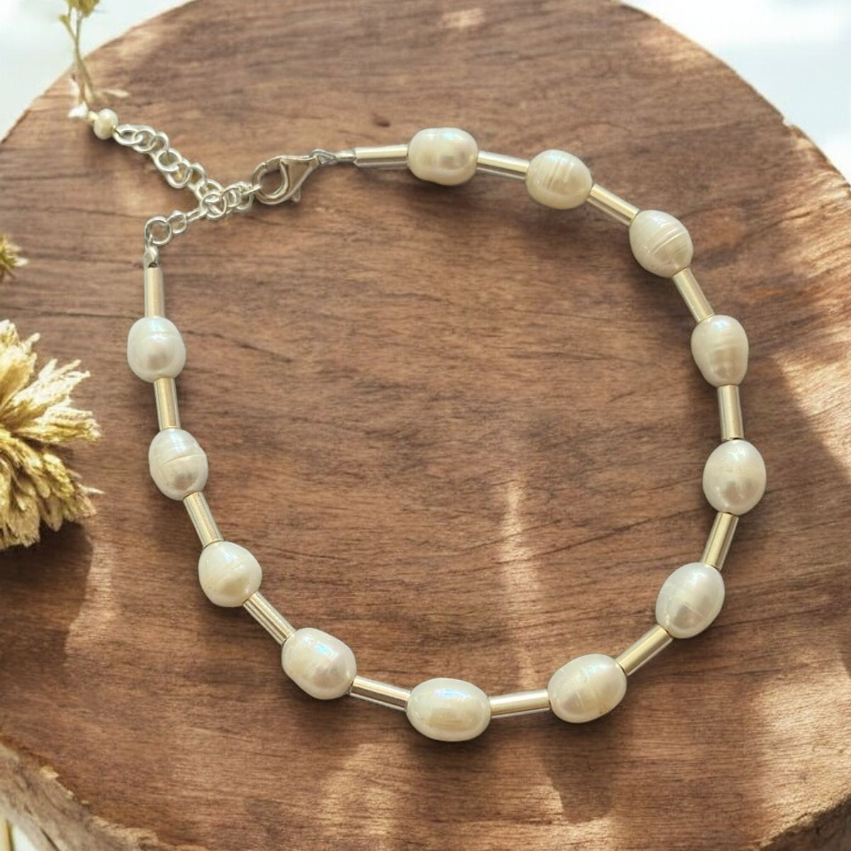 Embrace the spirit of summer with this 925 Sterling Silver Freshwater Pearl Bracelet. Perfect for beach outings or summer holidays, this bracelet is a beautiful blend of 925 sterling silver and genuine freshwater pearls. Its warm, shimmering design captures the essence of sunny days and relaxed, breezy nights. This piece not only adds elegance to your summer jewellery collection but also makes for a meaningful gift that celebrates the joyful energy of the season. Handcrafted with care, the minimalist design of this bracelet reflects the simplicity of laid-back summer styles. The lustrous 925 sterling silver provides a serene foundation that lets the natural glow of the freshwater pearls shine. Its adjustable length of 16-18 cm ensures comfort and versatility for any wrist size, and the secure lobster clasp guarantees it stays in place during all your holiday adventures. This bracelet seamlessly transitions from beach mornings to evening parties, making it a standout piece for summer occasions. Whether you're dressing up for a tropical getaway or a seaside dinner, its timeless elegance pairs effortlessly with any outfit. It's designed for versatility, allowing you to wear it layered with your other summer necklaces or as a standalone statement piece. Show someone you cherish them with this bracelet, a summer holiday jewellery piece that symbolises elegance and connection. It's more than just jewellery; it's a piece of wearable art that captures the carefree essence of summer. Gift it as a gesture of love or as a reminder of a special summer moment together. With its refined beauty, it’s sure to become a treasured part of any jewellery collection.
