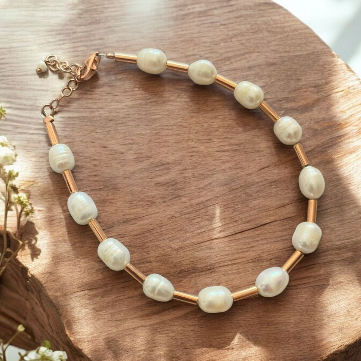 Embrace the warmth and joy of summer with our "Freshwater Pearl Rose Gold Bracelet." Perfect for sunny beach holidays and balmy evenings, this piece of summer jewellery captures the essence of laid-back elegance and luxurious style. Crafted meticulously with 925 sterling silver and adorned with a delicate rose gold plating, its glowing sheen beautifully complements the timeless charm of radiant freshwater pearls. This bracelet is a celebration of summer moments, perfect to accompany you on sun-soaked adventures or relaxed dinners by the sea. Handmade to order, each bracelet is a testament to high-quality craftsmanship and thoughtful design. Its minimalist yet sophisticated style embodies a summer holiday’s elegance, making it a versatile addition to your jewellery collection. The subtle interplay between the rose gold finish and the luminous pearls adds a touch of sun-kissed glow, mirroring the charm of a perfect summer day. Wear it as a chic accessory that enhances the simple beauty of your favourite summer outfits. Whether you're dressing up for an alfresco dinner or keeping it casual for a coastal stroll, this bracelet is your go-to piece for every occasion. Its adaptability ensures it pairs effortlessly with both breezy summer dresses and sophisticated resort wear. Designed for those who cherish both tradition and trend, it stands out as a timeless staple in any summer jewellery ensemble. Capture summer's beauty and sophistication in a single piece that will bring a sparkle to your warm nights and sun-dappled days. Gift this exquisite bracelet as a thoughtful token of your affection or appreciation during the summer season. It’s perfect for special moments celebrated under the sun, be it birthdays, anniversaries, or simply as a "just because" gift that echoes the joy and vibrancy of summer. Make this summer unforgettable with a symbol of elegance, endurance, and sunny sophistication, ideal for every beach lover and summer enthusiast.