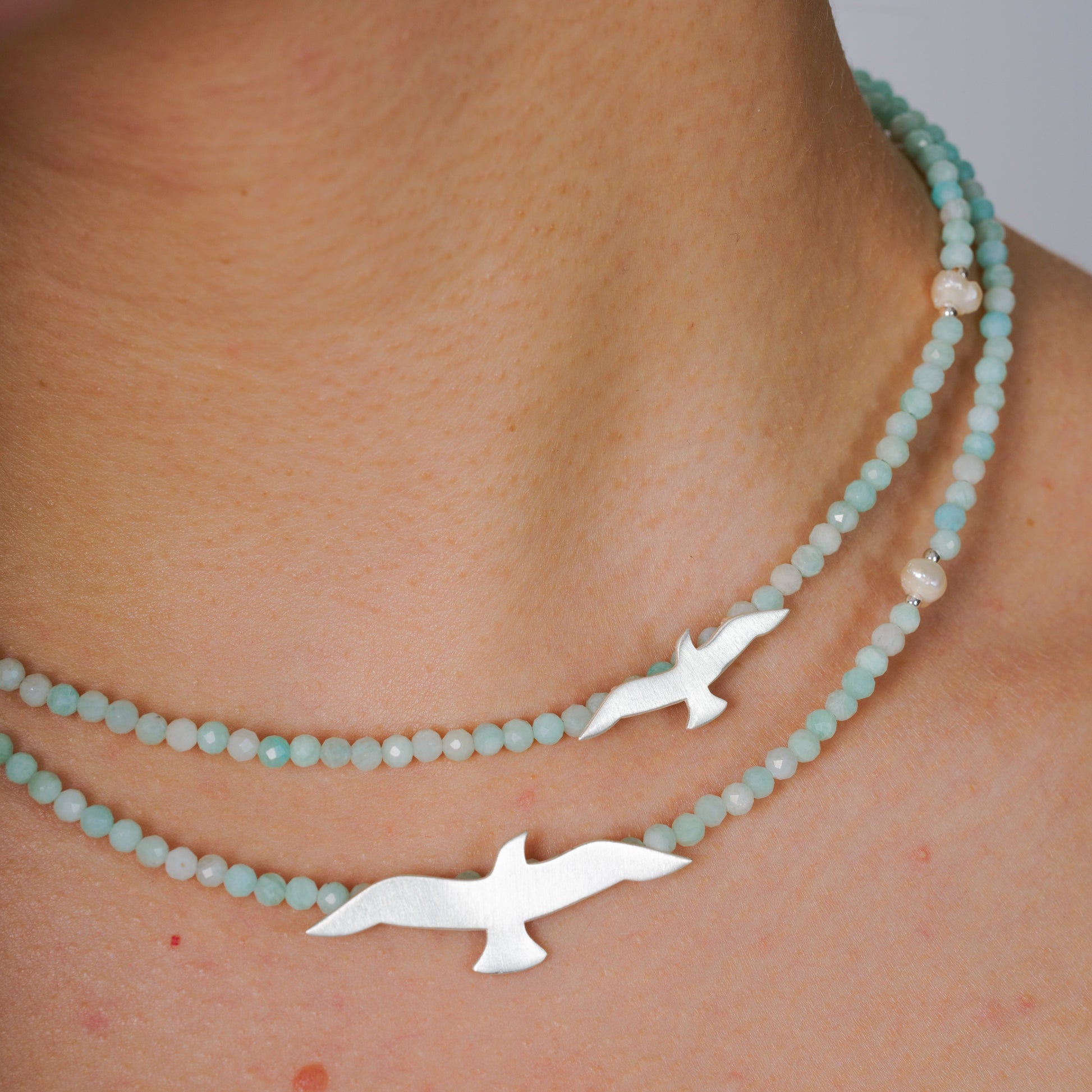 Amazonite Gemstone Necklace with Silver Seagull Pendants