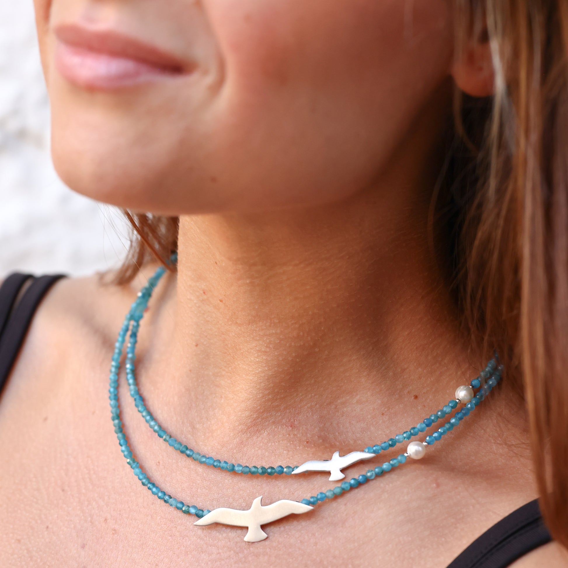 This apatite necklace features shimmering gemstones and 925 sterling silver accents in seagull designs. A beaded necklace detailed with a lobster claw closure, it offers both beauty and practicality.