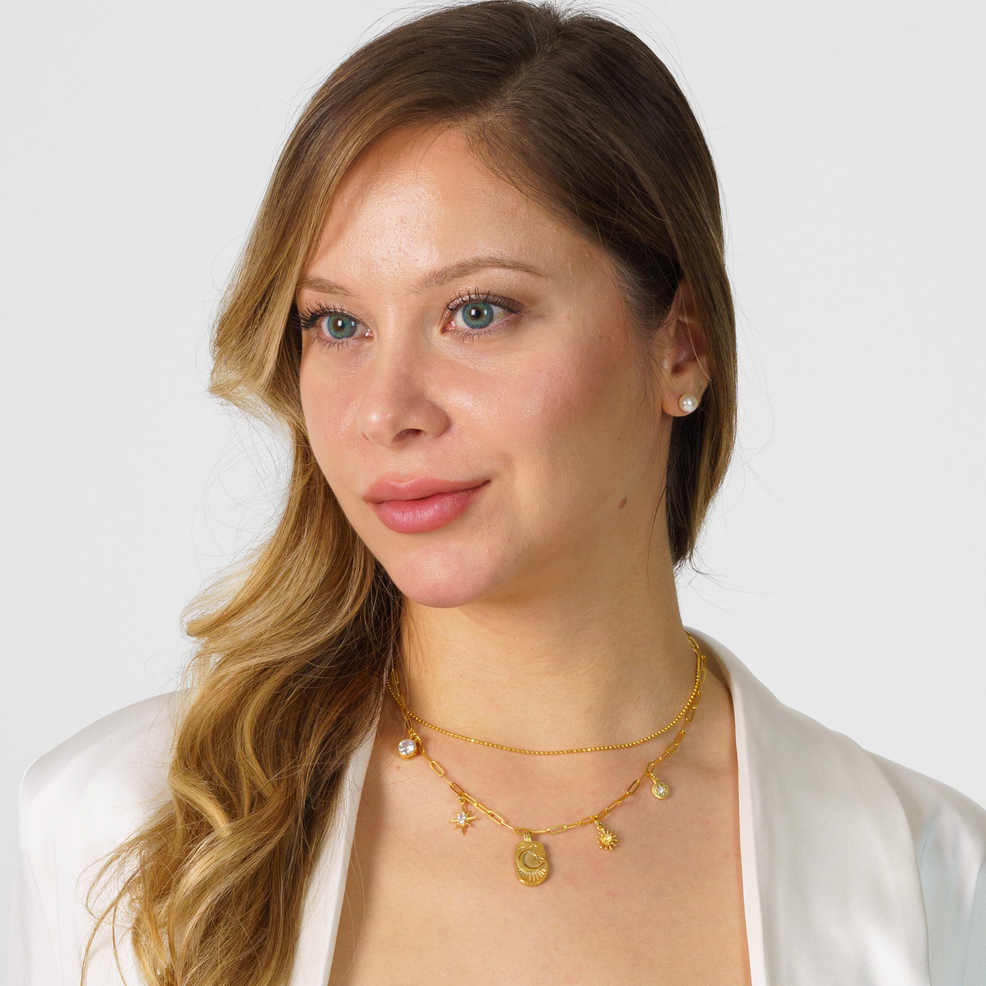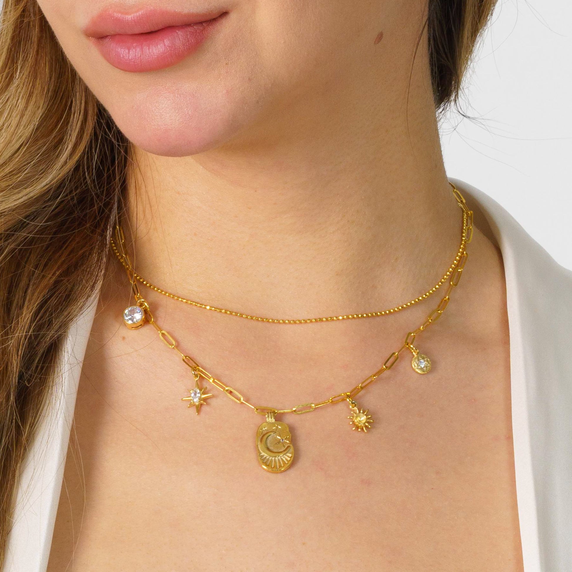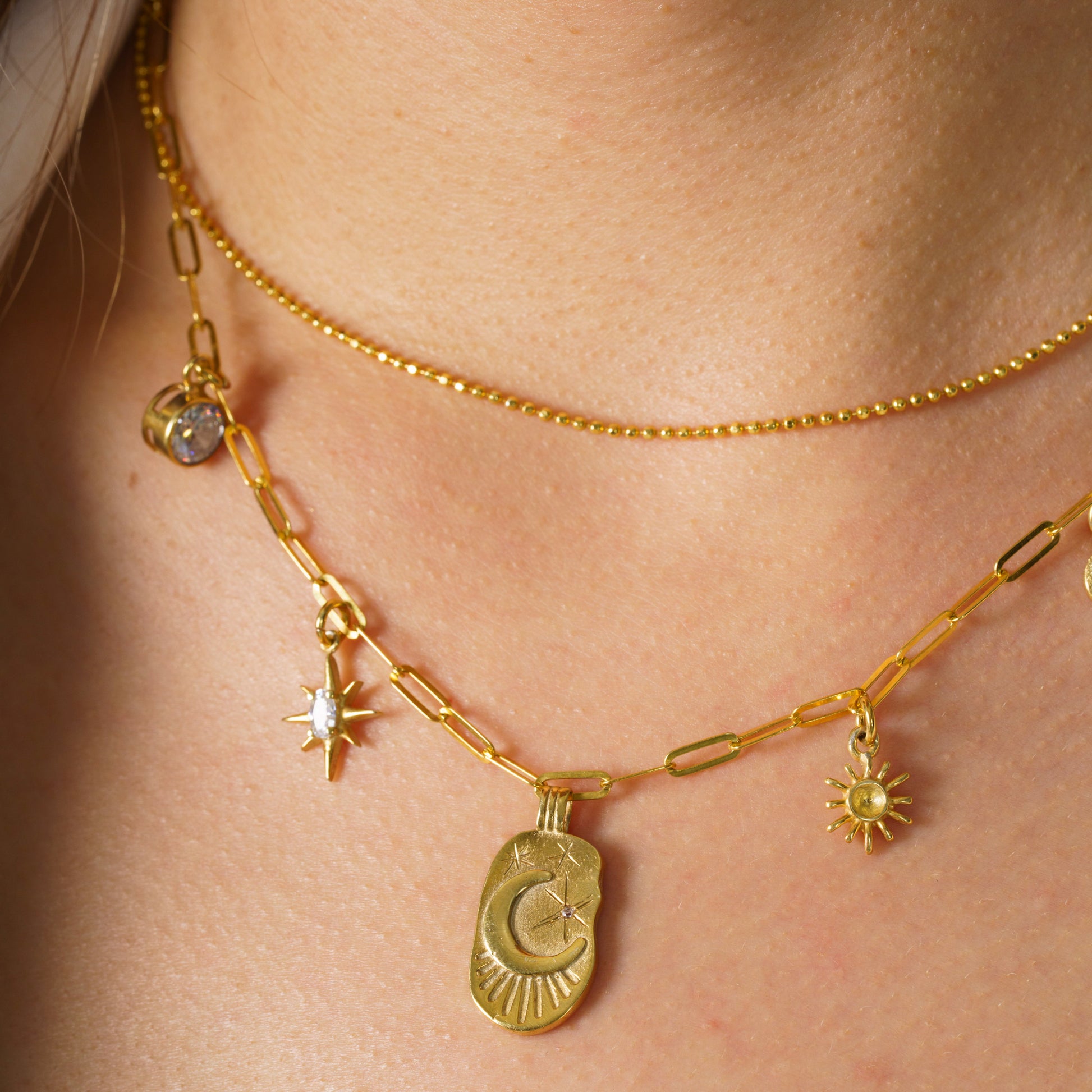 Embrace the warm glow of summer with our exquisite dainty necklace, perfect for those sun-kissed days and sultry nights. The elegant paperclip chain, adorned with celestial-themed charms of the sun, moon, and star, makes this piece an ideal accessory for all your summer and holiday events. Handcrafted with care and made from premium 925 sterling silver with luxurious gold-plating, this necklace adds a touch of sparkle to any sunny adventure. Each charm, symbolising the radiant energy of the sun, the cool allure of the moon, and the twinkle of the stars, captures the essence of those magical beach evenings and vibrant summer parties. The adjustable length allows you to wear it as a choker for casual daytime activities or lengthen it for a more graceful look during holiday dinners. It's a versatile summer jewellery piece that pairs effortlessly with breezy summer dresses or stylish beachwear. The lobster claw closure ensures your necklace stays secure, whether you're dancing through a lively festival or relaxing by the seaside. Make this summer unforgettable by choosing a piece that reflects both beauty and craftsmanship. This necklace is more than just an accessory; it’s a timeless keepsake that embodies the warmth and freedom of the sunny season. Gift this delightful necklace to your loved ones and let them carry the spirit of summer with them, wherever they go. Whether it's a summer birthday, a holiday celebration, or just a special day, this necklace will be cherished and remembered. Its charm lies not just in its stylish appearance but also in the memories it will create during those splendid sunny days.