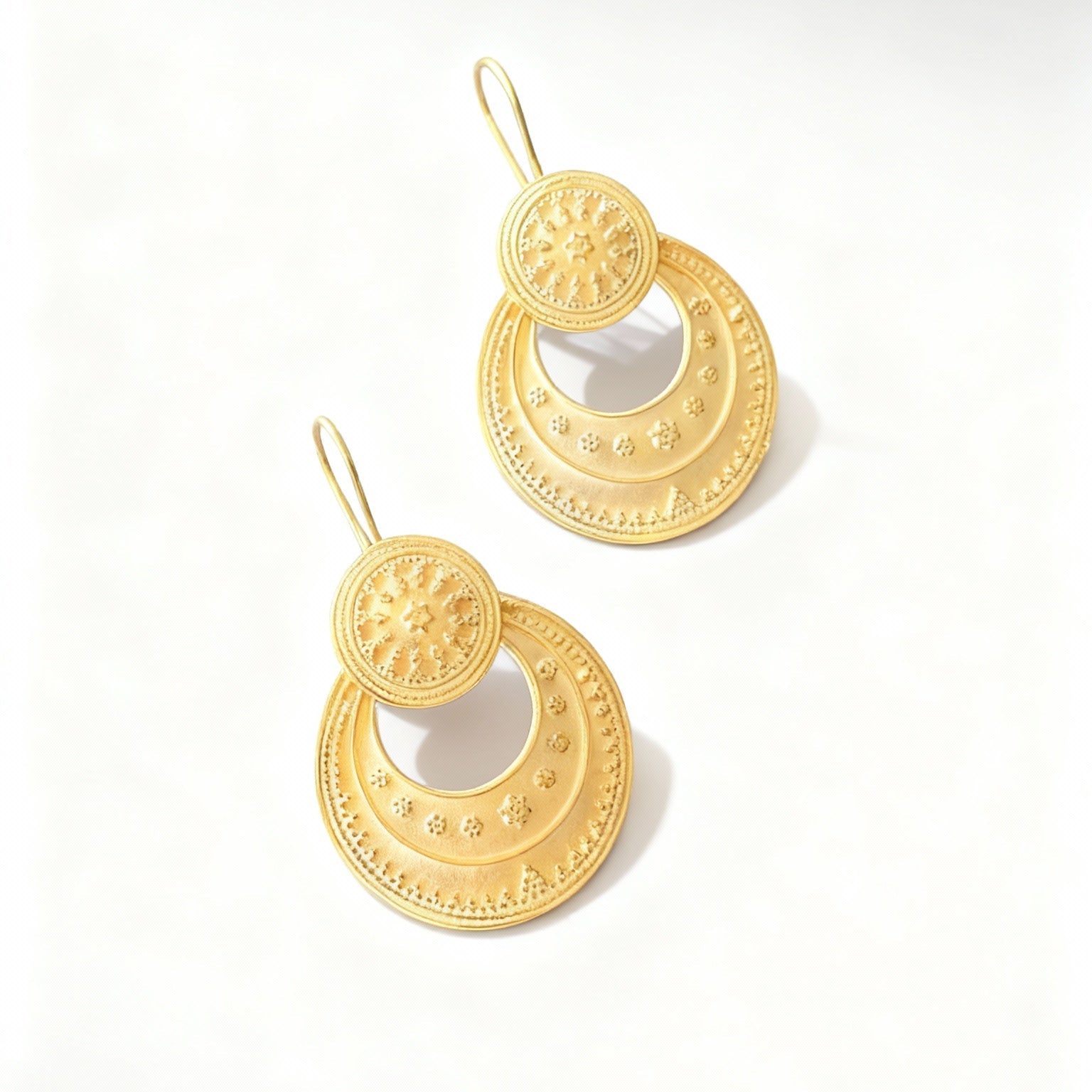 Elegant yet bold, these handcrafted earrings feature intricate circular motifs inspired by ancient Anatolian designs. The detailed embossed texture adds depth and timeless charm, reflecting traditional craftsmanship with a modern touch.