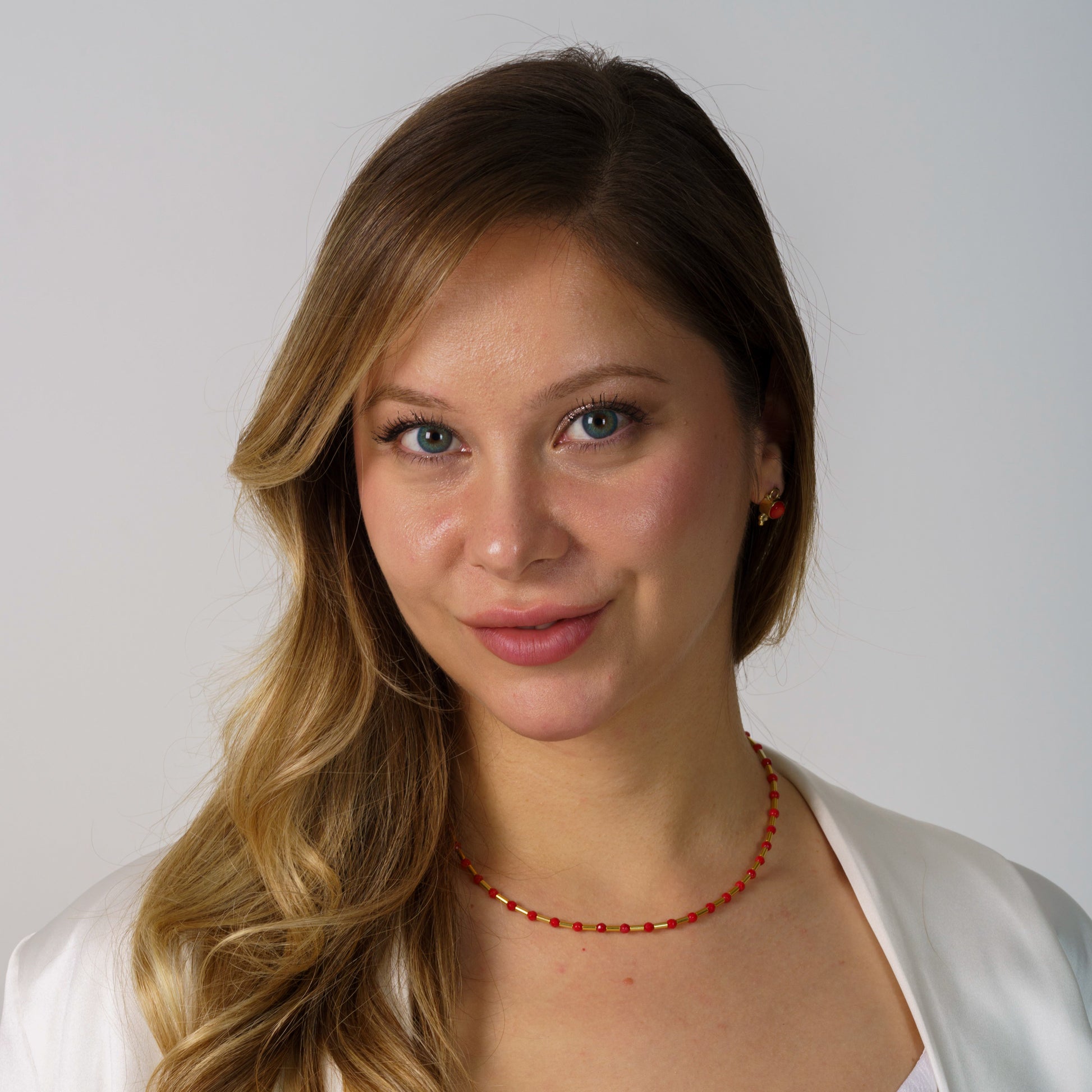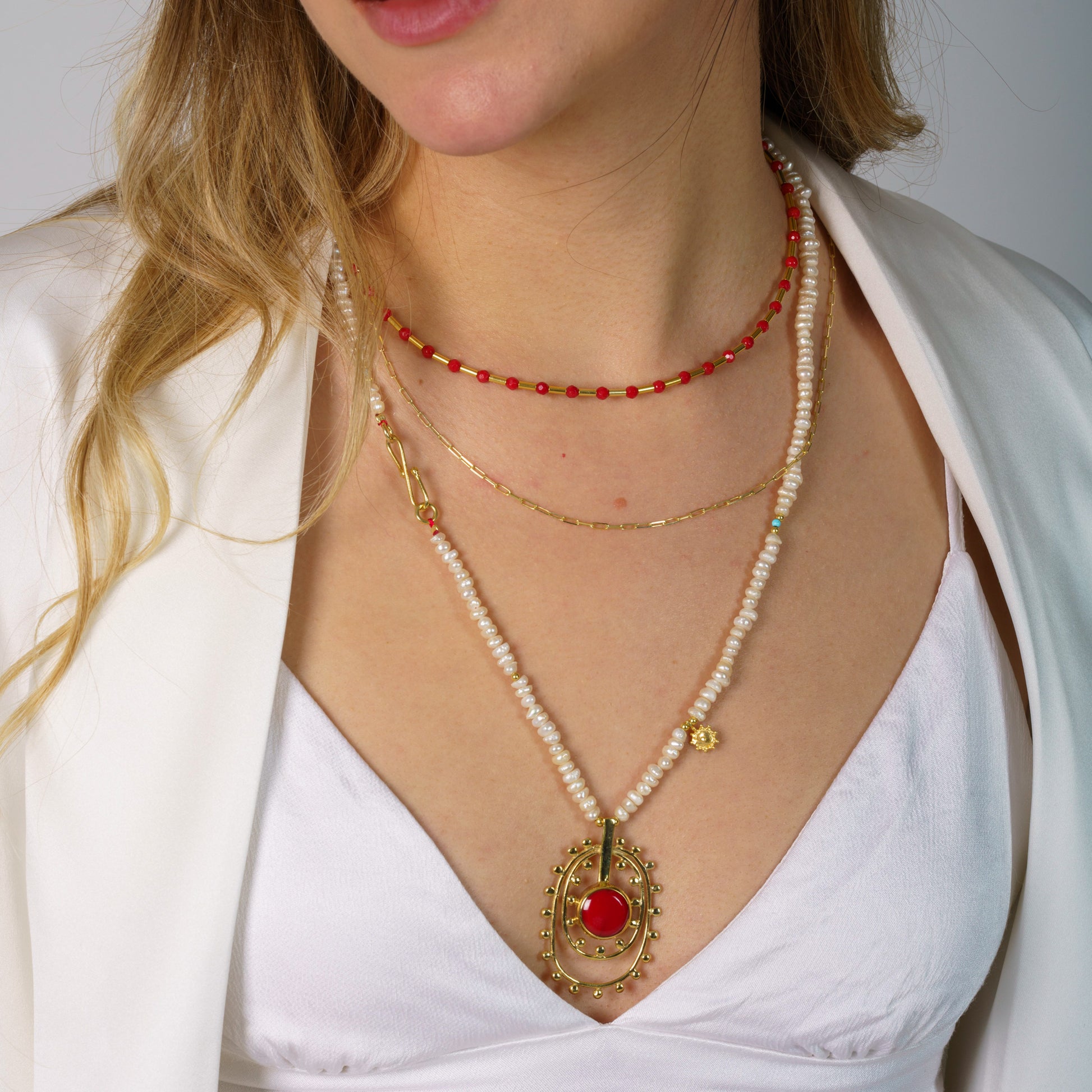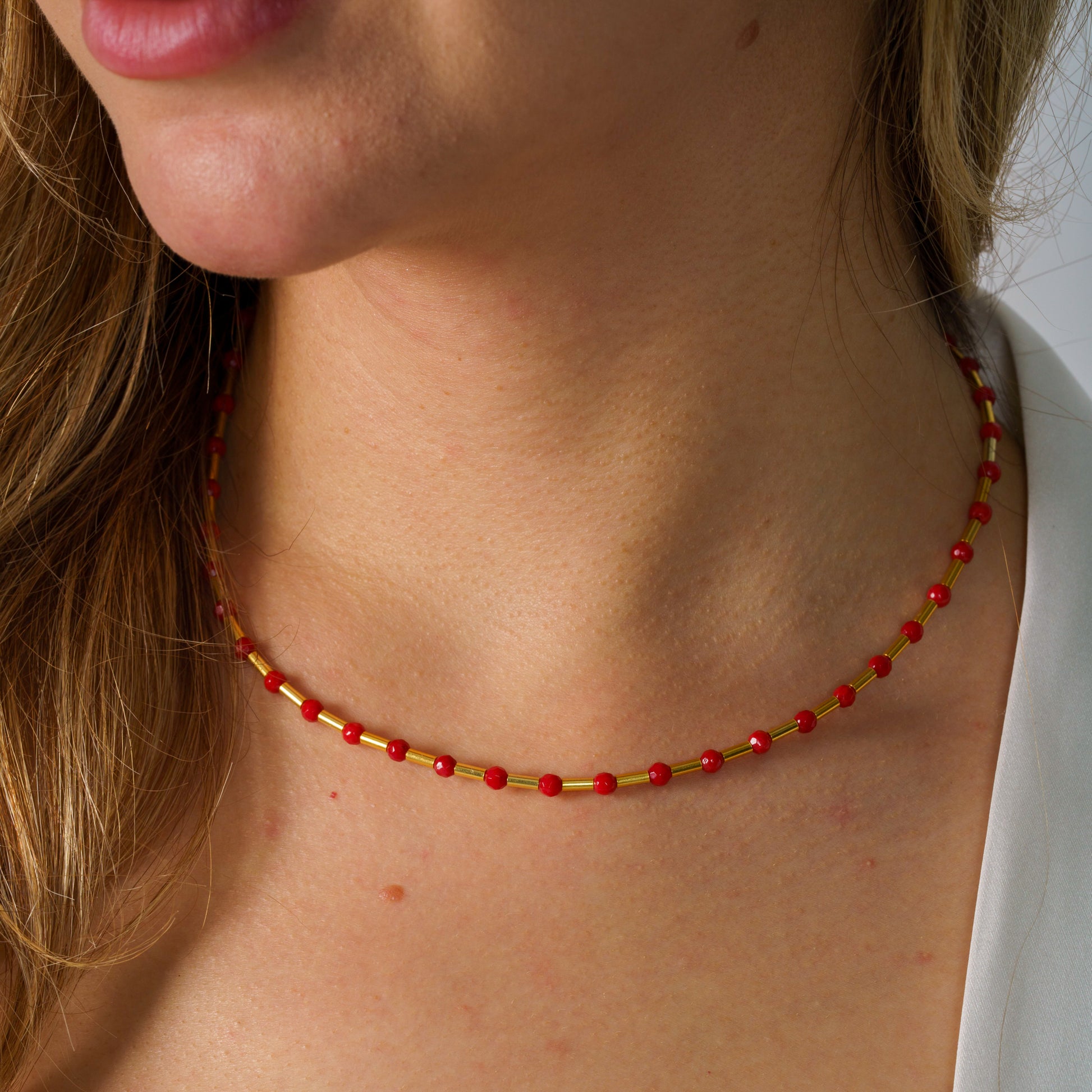 Our exquisite Coral Gemstone Necklace is a stunning piece of summer jewellery that perfectly embodies the essence of sunny beach days and warm holiday evenings. Handcrafted with love, this necklace combines vibrant coral gemstones reminiscent of tranquil ocean waters with the timeless appeal of 925 sterling silver and delicate 14K gold-plated elements. Ideal for enhancing her summer jewellery collection, this piece offers an unparalleled touch of graceful sophistication for any occasion. Designed by skilled artisans, this necklace features radiant coral gemstones interspersed with gleaming gold-plated beads, echoing the vibrant hues of a sun-kissed shoreline. Its minimalist design with coral accents makes it an ideal accessory for both relaxed beach outings and elegant holiday dinners. With a sturdy lobster claw clasp and an adjustable length of 40 cm plus an additional 4 cm, this necklace ensures a comfortable and secure fit as you enjoy your summer days. This piece's refined yet bold aesthetic enhances a myriad of summer styles, from pairing beautifully with a breezy sundress for a beach picnic to complementing a chic ensemble for a sunset dinner. The unique tones align with a broad spectrum of summery colours, helping her express her personal flair effortlessly. Elevate her everyday summer look or add brilliance to her holiday wardrobe with this classic yet contemporary jewellery piece. More than just an adornment, this necklace is a heartfelt gesture of love and appreciation. It’s perfect for gifting on special occasions like birthdays or anniversaries, or simply as a surprise to say "I cherish our moments together". Whether it's for friends jetting off on a holiday, daughters embarking on summer adventures, or even as a thank-you gift, it’s sure to make any summer occasion memorable. Show her how much she is loved by surprising her with a piece that captures the sunny spirit of your bond.