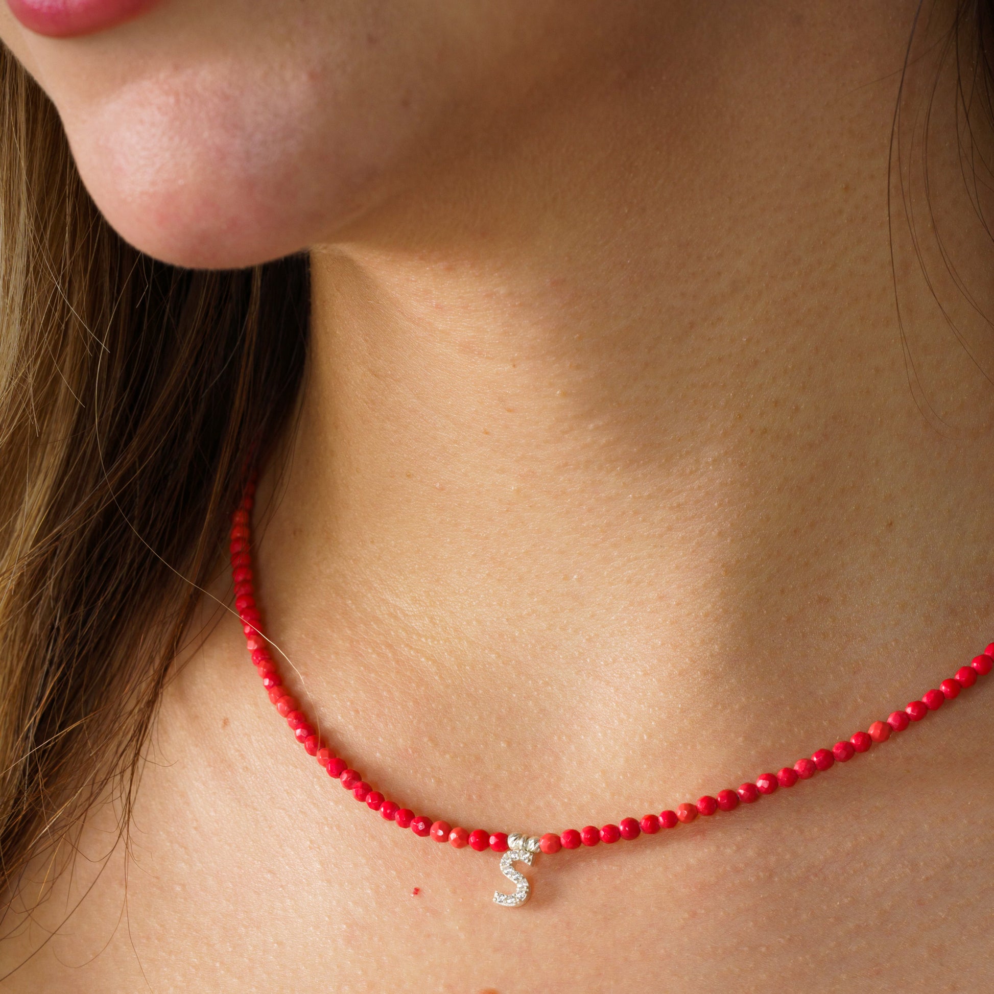 Coral Gemstone Necklace with Zirconia Letter Pendant