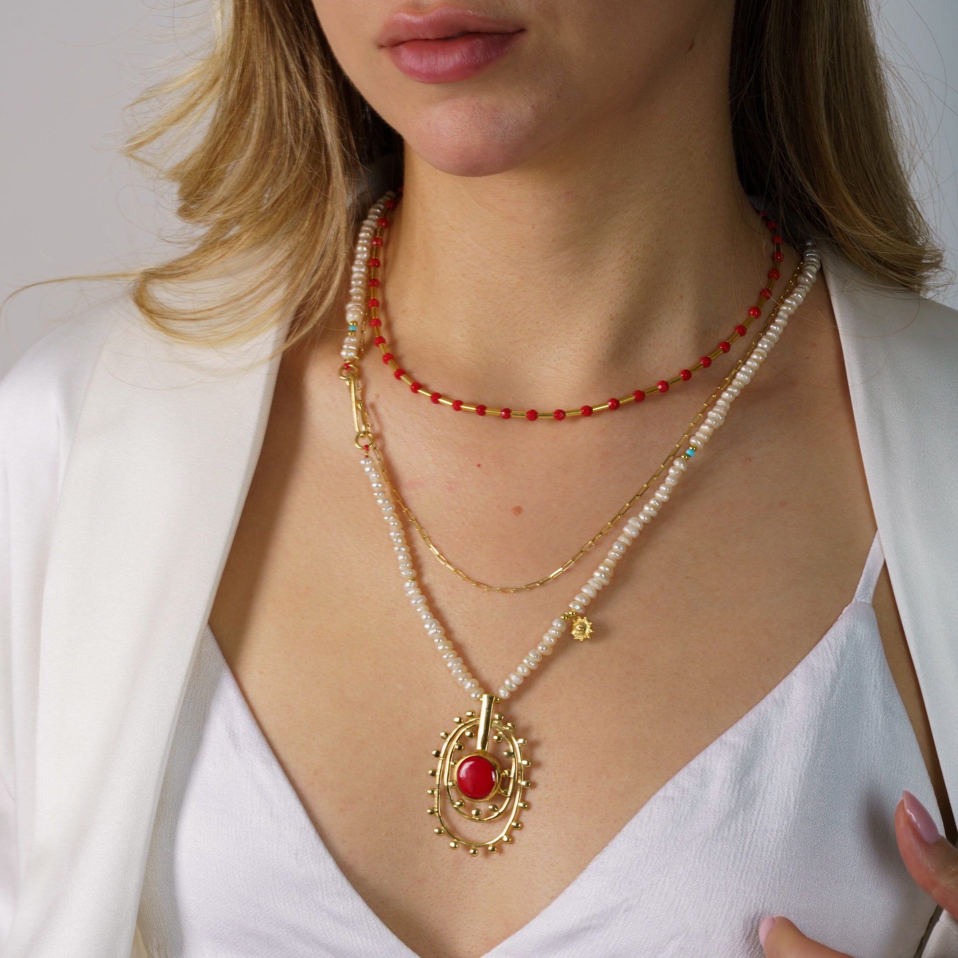 - Gemstones: Lustrous freshwater pearls, Oval red coral gemstone