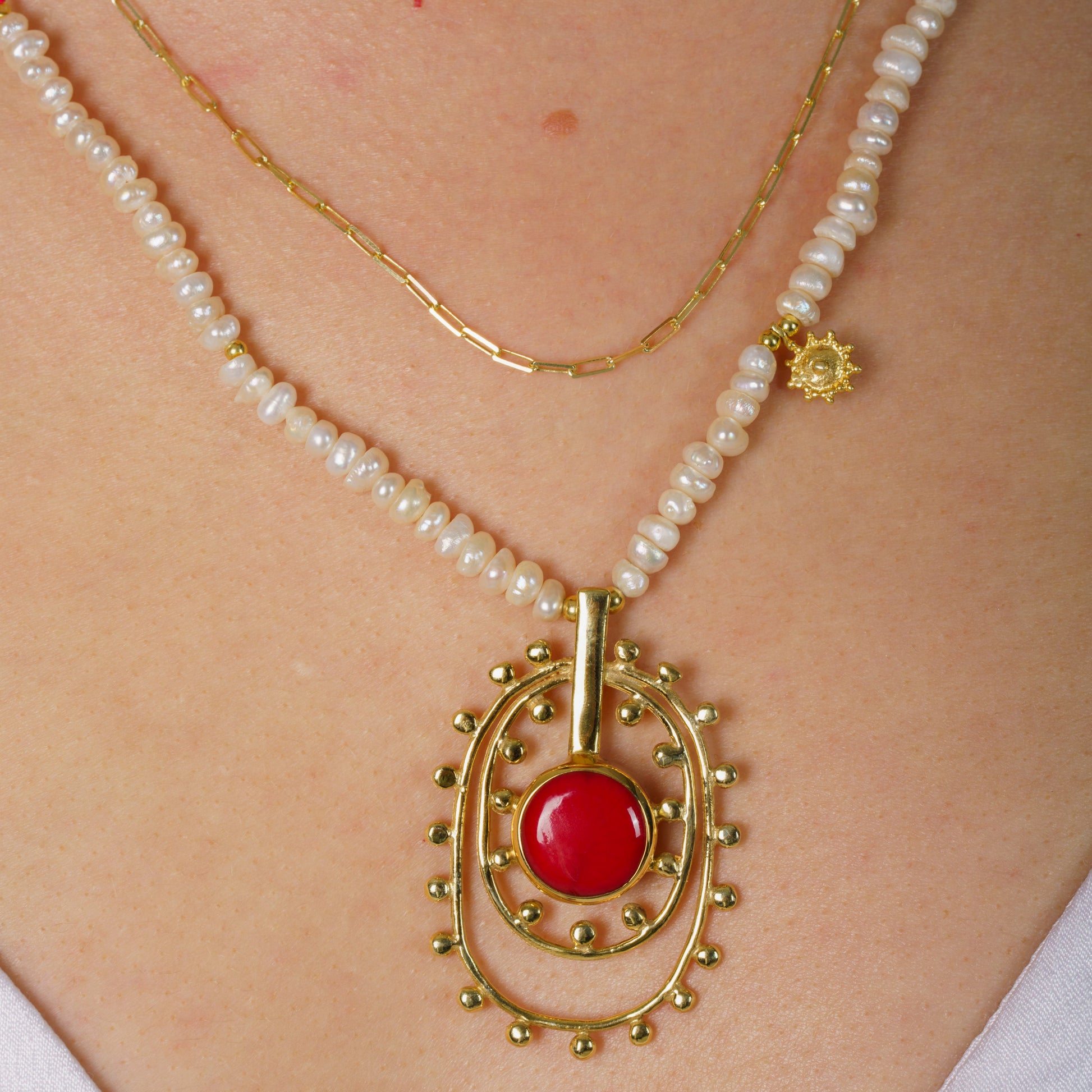 Embrace the essence of summer with our Handmade Freshwater Pearl Red Coral Necklace, the perfect holiday jewellery piece for warm beach getaways and sun-filled days. Each necklace is lovingly made to order, capturing the beauty of lustrous freshwater pearls paired with a vibrant red coral gemstone, making it an accessory that speaks of elegance and strength. The sun-ray inspired design, set in 925 Sterling Silver and plated with 14k Gold, creates a stunning centrepiece, offering a touch of the sun's glow to your summer jewellery collection. This necklace is more than jewellery; it's a piece of art that celebrates the natural beauty of hand-selected gemstones. Whether you're strolling along the sandy beaches or enjoying a holiday dinner by the coast, this necklace adds a splash of sophistication to your warm weather wardrobe. The exquisite craftsmanship shines through, ensuring it's a cherished piece for many summers to come. Versatile and stylish, this necklace effortlessly transitions from sunny beach outings to cool summer nights out. Pair it with a flowy summer dress for an elegant look, or with a breezy top and shorts for a laid-back vibe. As a summer necklace, it enhances your collection, capturing the carefree spirit of summer days and the relaxation of holiday nights. Gift the timeless elegance of a summer sunset with this beautiful necklace. Perfect for holiday gifting or celebrating special summer moments, it's a piece that resonates with those who adore intricate detail and exquisite craftsmanship. Create memories that last a lifetime with a necklace that evokes warmth, grace, and the joyful essence of summer days and nights.