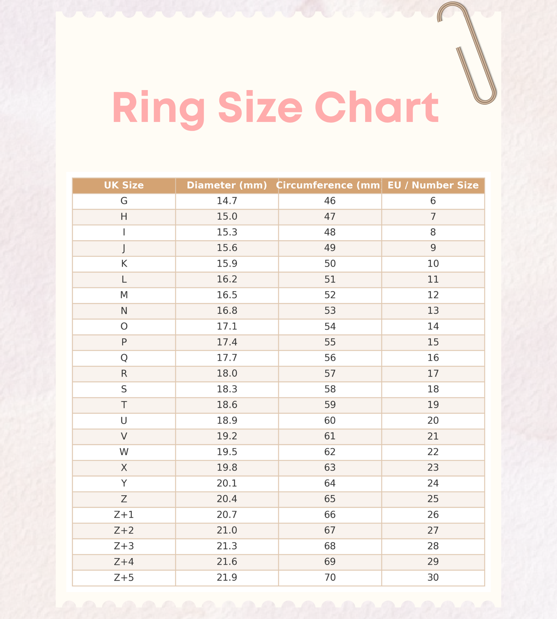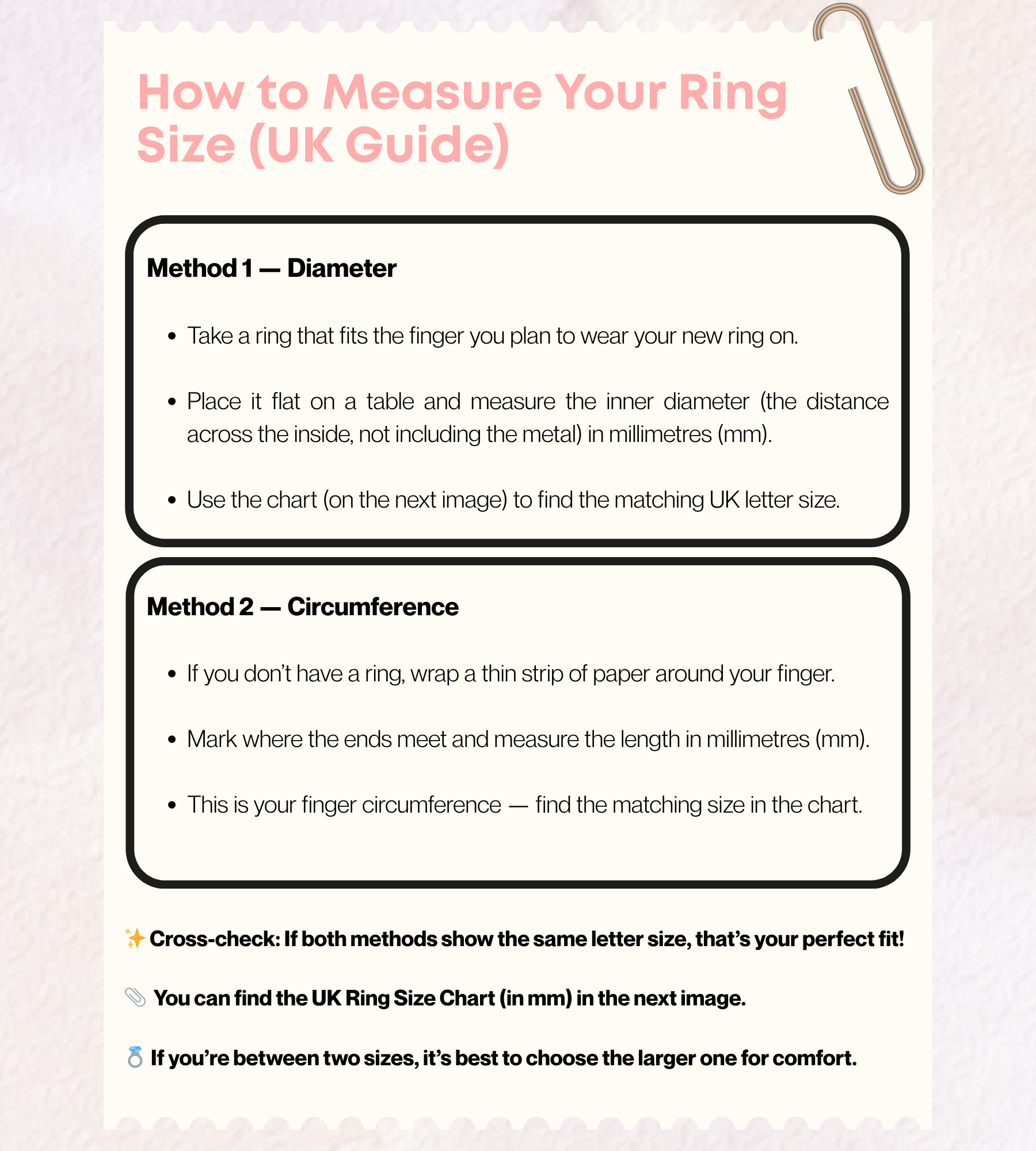 Sizing: For the best fit, kindly measure your ring size first. You’ll find the step-by-step guide and the UK size chart in the product images. And, send us your ring size after ordering.