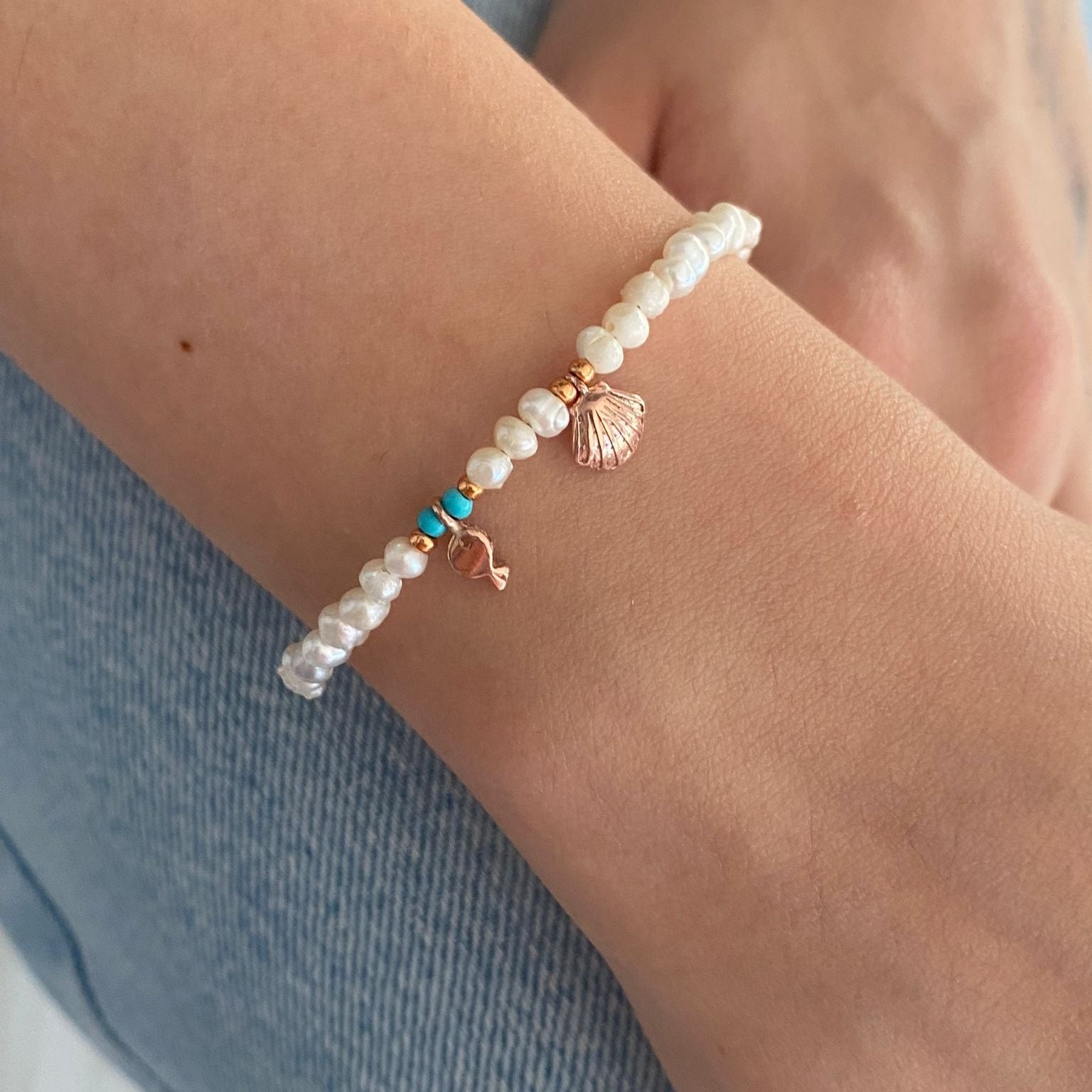 Embrace the bliss of summer with our Freshwater Pearl Bracelet, adorned with Silver Seashell and Fish Charms. This exquisite piece captures the essence of sunlit beaches and warm summer nights. Each hand-selected freshwater pearl glistens with natural beauty, perfectly paired with 925 sterling silver craftsmanship. The vibrant seashell and fish charm details evoke the tranquillity and scenic beauty of the Aegean Sea, reminiscent of cherished coastal holidays. Perfect for holiday jewellery, this bracelet combines symbolic pearls with sea-inspired elements to connect the wearer with serene moments by the azure waters. The adjustable length ensures a perfect fit, making it a versatile addition to your summer jewellery collection. Whether worn during long strolls by the shore or evening gatherings under the stars, its understated elegance lights up any occasion. Imagine stepping out into the summer sun, each pearl capturing the light as you enjoy an afternoon by the sea or a night of laughter and memories. This bracelet transitions effortlessly from beachside casual to sophisticated evening wear, making it an ideal companion for any summer activity. Crafted with a commitment to quality, this timeless piece is more than just jewellery; it’s a celebration of enduring style and summer memories. Surprise a special someone with this thoughtful gift that combines elegance and the enchanting spirit of the ocean. Celebrate sun-kissed days and warm, breezy nights in timeless fashion.