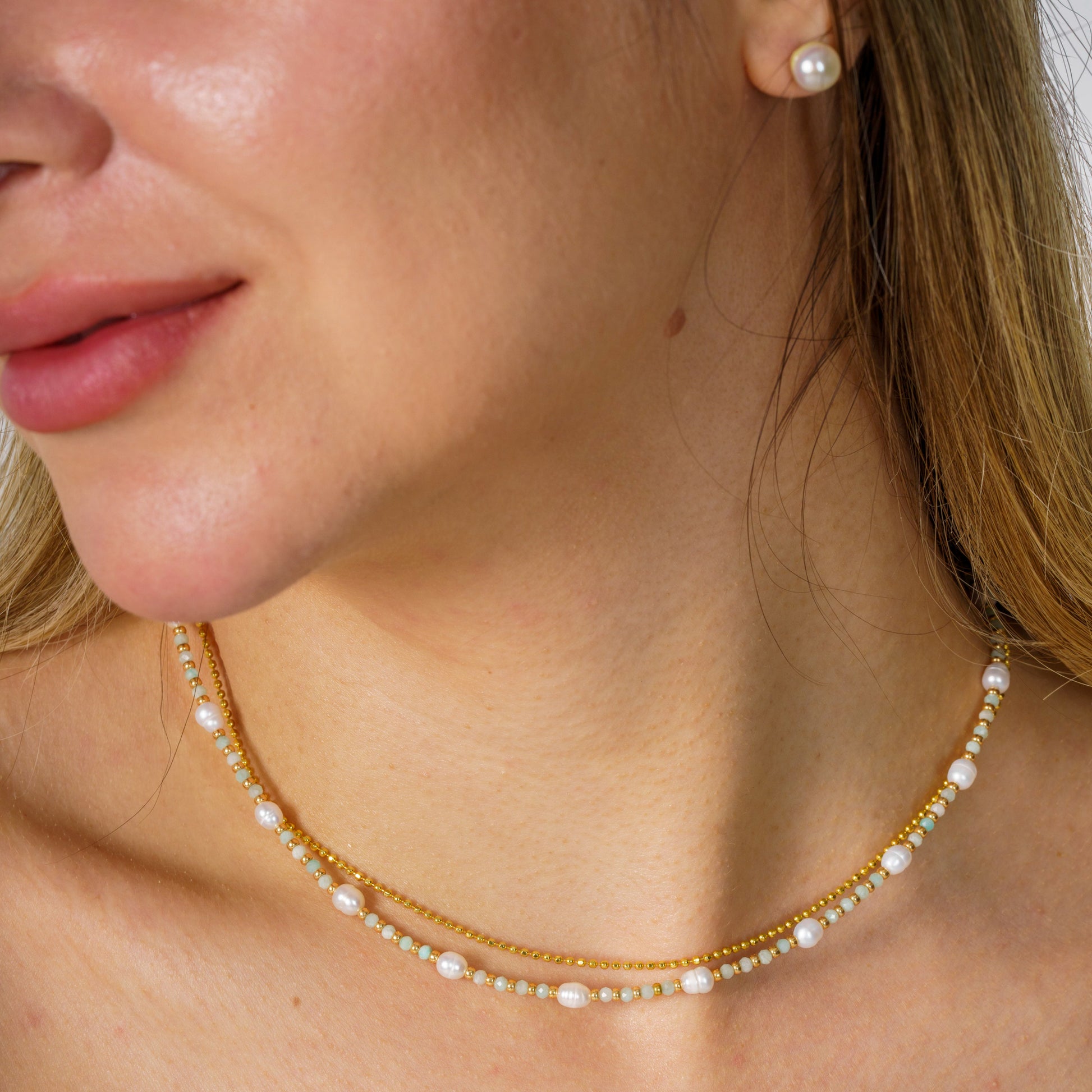 Dive into the warm ambiance of summer holidays with our stunning 925 Sterling Silver Freshwater Pearl and Amazonite Necklace. This piece, enriched by the calming blues of Amazonite gemstones and the iridescent glow of freshwater pearls, captures the essence of balmy beach days and sultry summer nights with effortless elegance. Perfect as a summer gift, this necklace radiates the relaxed vibe of holiday jewellery, making it an ideal choice for those sun-kissed days. Meticulously handmade from luxurious 925 sterling silver, this necklace showcases top-quality craftsmanship. Its adjustable length varies between 40 cm and 44 cm, offering versatile styling options to complement any summer outfit. The silver lobster claw clasp not only ensures a secure fit but also adds a touch of sophistication, seamlessly integrating with sun-drenched beach attire or an evening summer dress. Imagine gifting this exquisite piece on a sunlit afternoon, where its calming hues mirror the azure ocean waves. Envision her surprise and joy as she discovers this necklace, a token of your appreciation that perfectly encapsulates serene summer sophistication. The delicate blend of pearls and Amazonite signifies tranquillity and timeless style—ideal for leisurely beach walks, sun-kissed picnics, or vibrant summer parties. This Freshwater Pearl and Amazonite Necklace isn't just a piece of jewellery; it's an embodiment of the joyful memories created under the sun's glow. Perfect for layering with other summer jewellery or wearing solo for a chic, minimalist look, this necklace adds a cool, elegant touch to any holiday wardrobe, remaining a cherished keepsake of those endless summer days.