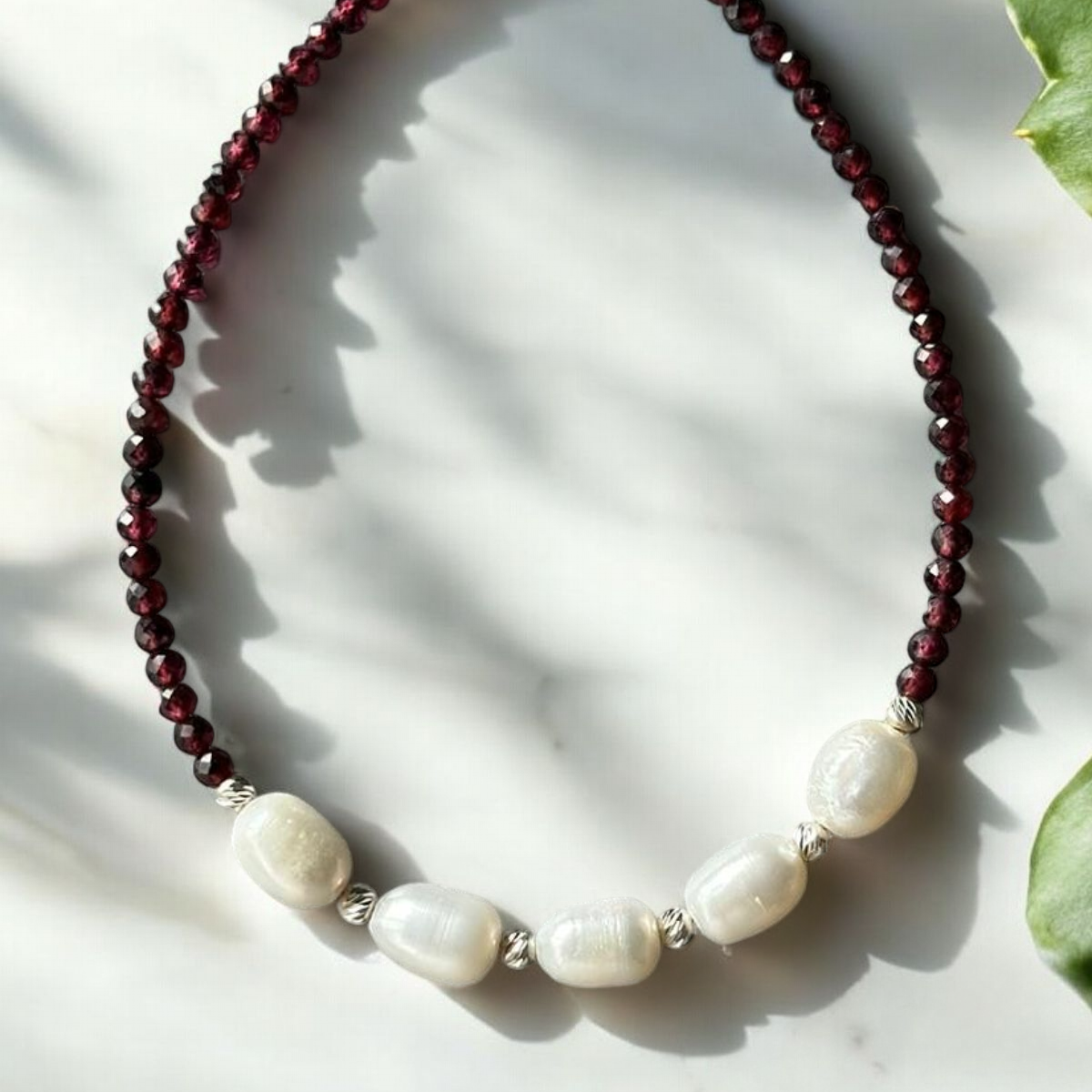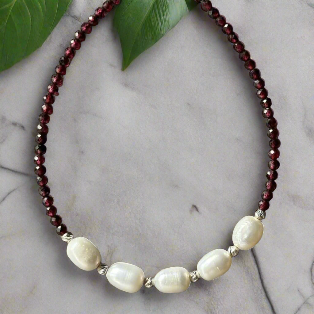 - Gemstone Type: Freshwater pearls and garnet gemstones