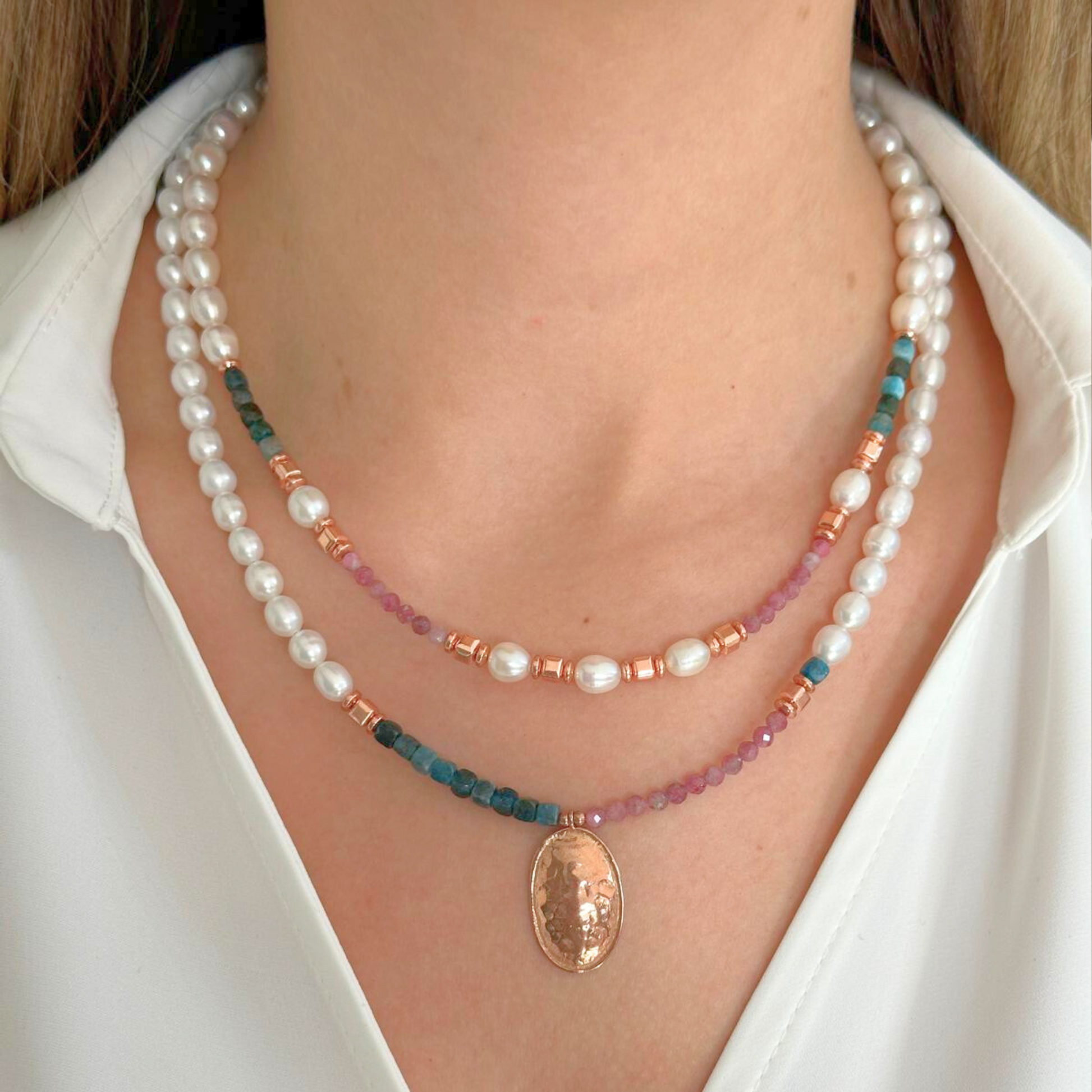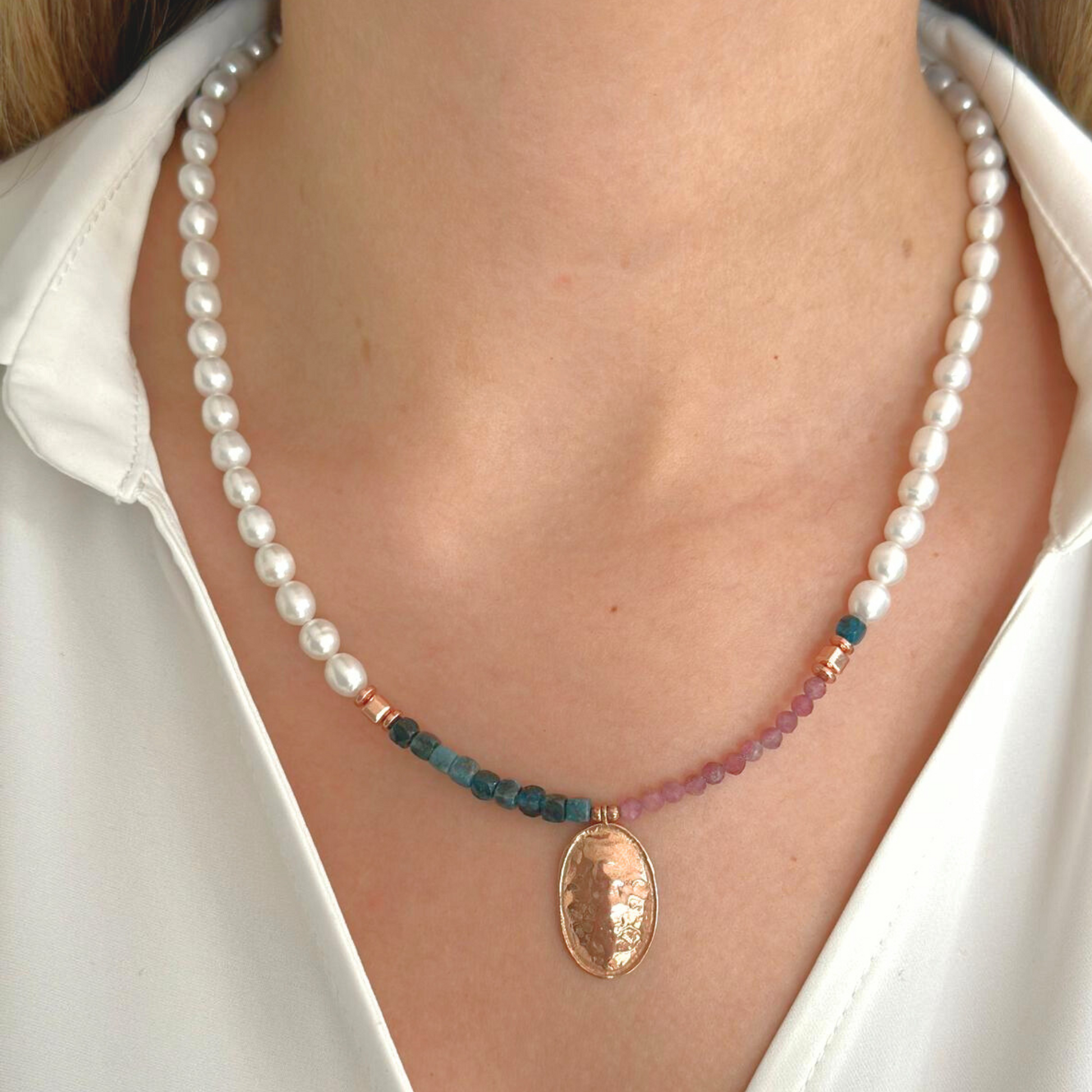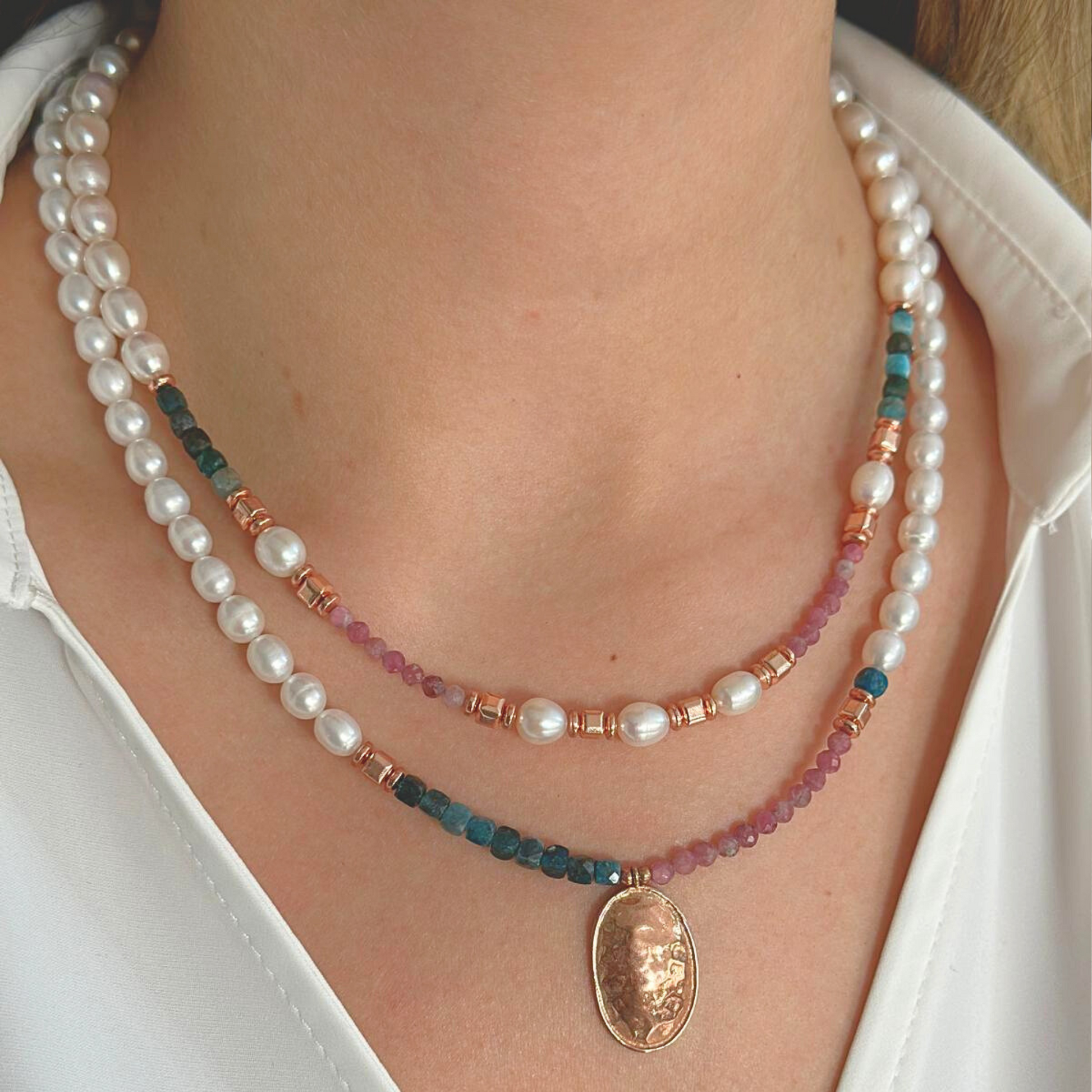 This elegant necklace is a stunning combination of lustrous freshwater pearls and vibrant gemstones, thoughtfully arranged to bring colour and character to any look. At its centre hangs a beautifully textured rose gold-plated sterling silver pendant, adding warmth and a touch of modern charm. The freshwater pearls offer a classic and refined look, while the arrangement of colourful gemstones adds a contemporary twist.