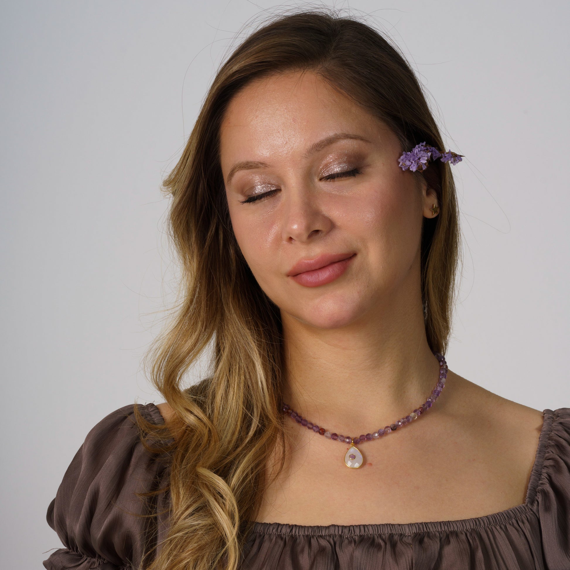 Embrace the sunshine and sea breezes this summer with our stunning Moonstone and Amethyst necklace. Perfect for holiday jewellery, this exquisite piece captures the essence of summer with its shimmering moonstone pendant reflecting the warmth and mystery of the ocean, perfectly complemented by the vibrant, sunlit hues of amethyst beads. Handcrafted with love, this necklace celebrates joy and relaxation, a perfect companion for lazy beach days or summer nights out. The moonstone pendant of this necklace glows as softly as a summer moonlit night, offering a mystical allure that captures the enchantment of summer evenings by the sea. This natural gemstone necklace, beautifully crafted with premium materials, boasts an adjustable length to fit any neckline comfortably, bringing a touch of summer elegance to your holiday wardrobe. Secure clasp ensures that it stays beautifully in place whether you’re strolling on the sands or dining al fresco. Versatile and refined, our necklace is ideal for layering, just as the summer layers its warm days into cool evenings. Wear it alone as an elegant statement or mix it with your other summer jewellery for a contemporary look. From beach parties to open-air garden weddings, its serene and vibrant presence makes it a standout piece that enhances any summer outfit. Welcome the admiration from friends and strangers alike as you bask in the beauty of this summer jewellery. More than just a piece of jewellery, our necklace is a keepsake designed to cherish special summer moments with loved ones. Gift it to someone dear as a token of your unforgettable beach holidays or surprise a friend with a timeless reminder of a serene summer by the coast. Celebrate the magic of summer nights and days with this uniquely crafted piece, which promises to connect hearts and bring warmth wherever life takes you. Let it be your symbol of love and joyful memories.