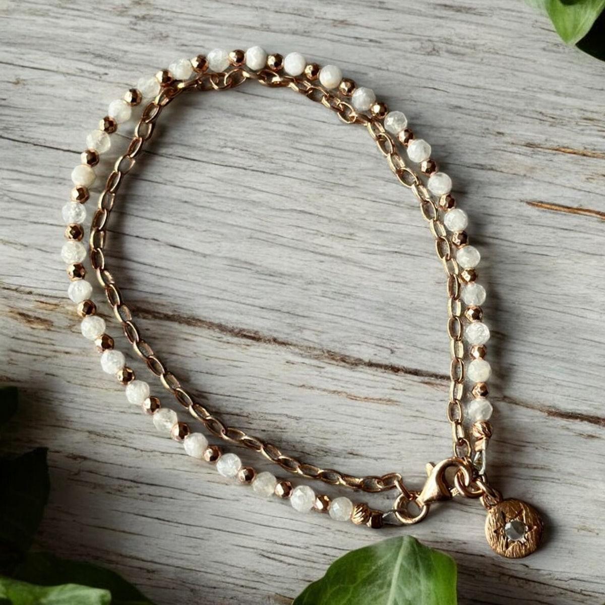 Embrace the spirit of summer with our dazzling Moonstone Hematite Rose Gold Bracelet. This exquisite handmade piece captures the essence of warm sunlit days and breezy beachside nights, perfect for your summer jewellery collection. The harmony between natural moonstone and hematite brings a seaside calm, reminiscent of gentle waves and golden sunsets, making it an ideal holiday jewellery choice. Crafted from the finest 925 sterling silver and adorned with vibrant rose gold, this bracelet gleams with the warmth of a summer afternoon. Each handpicked moonstone and hematite stone adds a touch of nature’s beauty, designed to complement your style and the carefree spirit of summer adventures. As handmade to order, you can be assured each piece is a unique statement of contemporary elegance and sun-drenched charm. Whether you're celebrating a summer birthday, an anniversary under the stars, or simply wanting to add a touch of shine to your seasonal wardrobe, this bracelet serves as more than just an accessory. It embodies the light-hearted joy and beauty of summer, ready to enhance any occasion with its chic, versatile design. Customisable upon request, it ensures a perfect fit for all your summer outings. Bring sunshine to your collection and make it a part of your memorable summer experiences. Reflecting the simple joys of lazy beach days and vibrant summer nights, this bracelet is set to be your personal summer treasure, reminding you of warmth and style wherever you go.