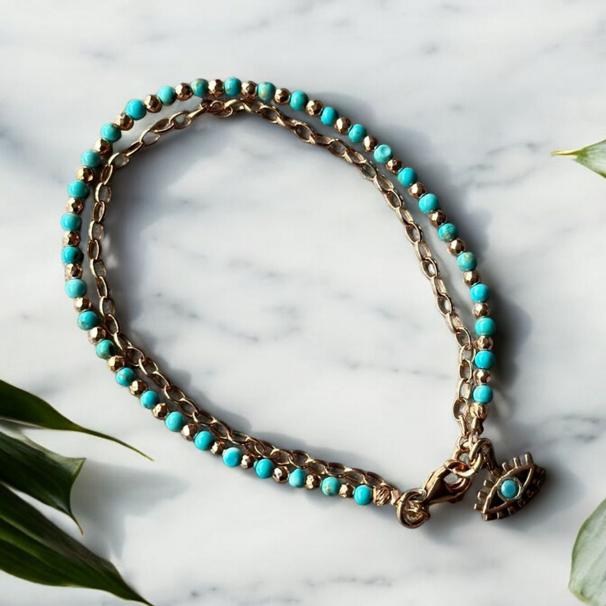 Step into the world of sun-kissed beaches and warm summer evenings with our Handmade Turquoise and Hematite Dual-Strand Gemstone Bracelet. This exquisite piece embodies the essence of summer jewellery, making it an ideal holiday accessory. The vibrant turquoise paired with the grounding beauty of hematite reflects the calming ocean waves and the serene tranquility of sandy shores. Crafted with high-quality 925 sterling silver and accented with rose gold plating, this bracelet exudes elegance with its meticulous dual-strand design. The responsibly sourced turquoise and hematite gemstones create a perfect summer necklace companion, adding a splash of tropical charm that complements beachwear and evening attire. The adjustable feature ensures a comfortable fit, making it suitable for any summer adventure. Whether you're spoiling yourself, preparing for a beach holiday, or looking to give a thoughtful gift, this bracelet is a perfect choice. Its versatile design caters to any occasion, be it a casual seaside lunch or a relaxed summer evening gathering. It's more than just jewellery; it’s a piece of summer to wear and cherish, offering both functionality and style with its secure lobster clasp. Each bracelet tells its own story of care and dedication, handmade to order with extraordinary craftsmanship. The adjustable length allows you to customise the fit, ensuring it becomes an ideal accessory from day-to-night engagements. Celebrate the joy of summer and the warmth of the sun with this handcrafted piece designed to bring a touch of elegance to any look.