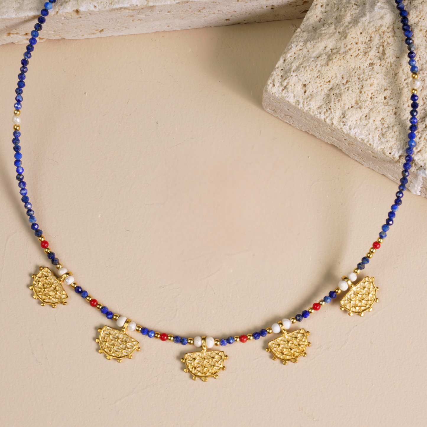 Dive into the vibrant essence of summer holidays with our Lapis Lazuli Sterling Silver necklace, designed for sun-drenched days and breezy nights. The deep blue Lapis Lazuli gemstone reflects the tranquil sea, while the rich coral beads echo the vibrant hues of a sunset. Meanwhile, the freshwater pearls lend a touch of the ocean's gentle waves, creating a necklace that's perfect for any summer occasion. This piece embodies warm memories by the beach and captures the spirit of summer holiday jewellery. Handcrafted with precision and passion, each necklace is a unique expression of the artist's dedication. The Hittite Sun symbol in the design illuminates the jewellery with historical elegance, evoking the ancient allure of eternal sunshine. Set in durable 925 Sterling Silver, the necklace offers both lightweight comfort and a versatile style, effortlessly elevating your summer outfits whether you're lounging by the sea or exploring new destinations. An ideal summer jewellery gift for loved ones, the necklace suits various styles and occasions. Whether worn daily during the warm months or saved for special sunny events, the elegance and quality are evident in every handcrafted bead and detail. Celebrate the thoughtfulness and beauty of this summer necklace, a perfect companion for beach outings and holiday adventures. Our unique necklace is not only a fashionable summer statement but also a tasteful way to commemorate anniversaries, holidays, or birthdays. Its charming blend of tradition and modernity makes it a memorable addition to any summer wardrobe, adding a touch of handcrafted artistry to unforgettable holiday moments.