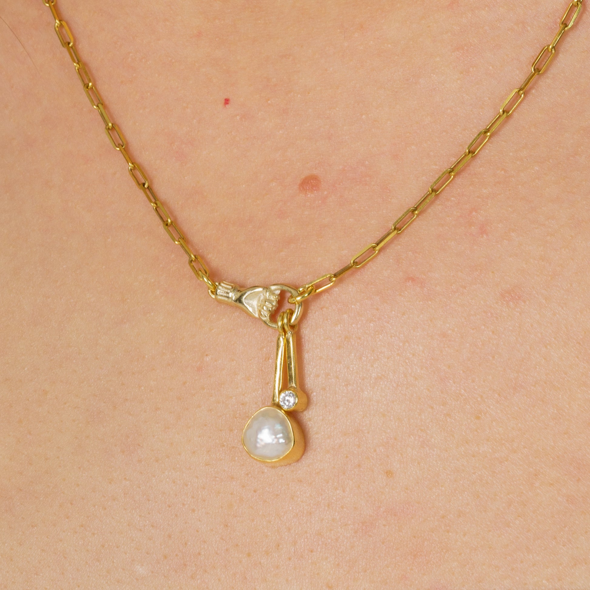 - Pendant: Artisan-inspired design with one irregularly shaped pearl and a petite round diamond