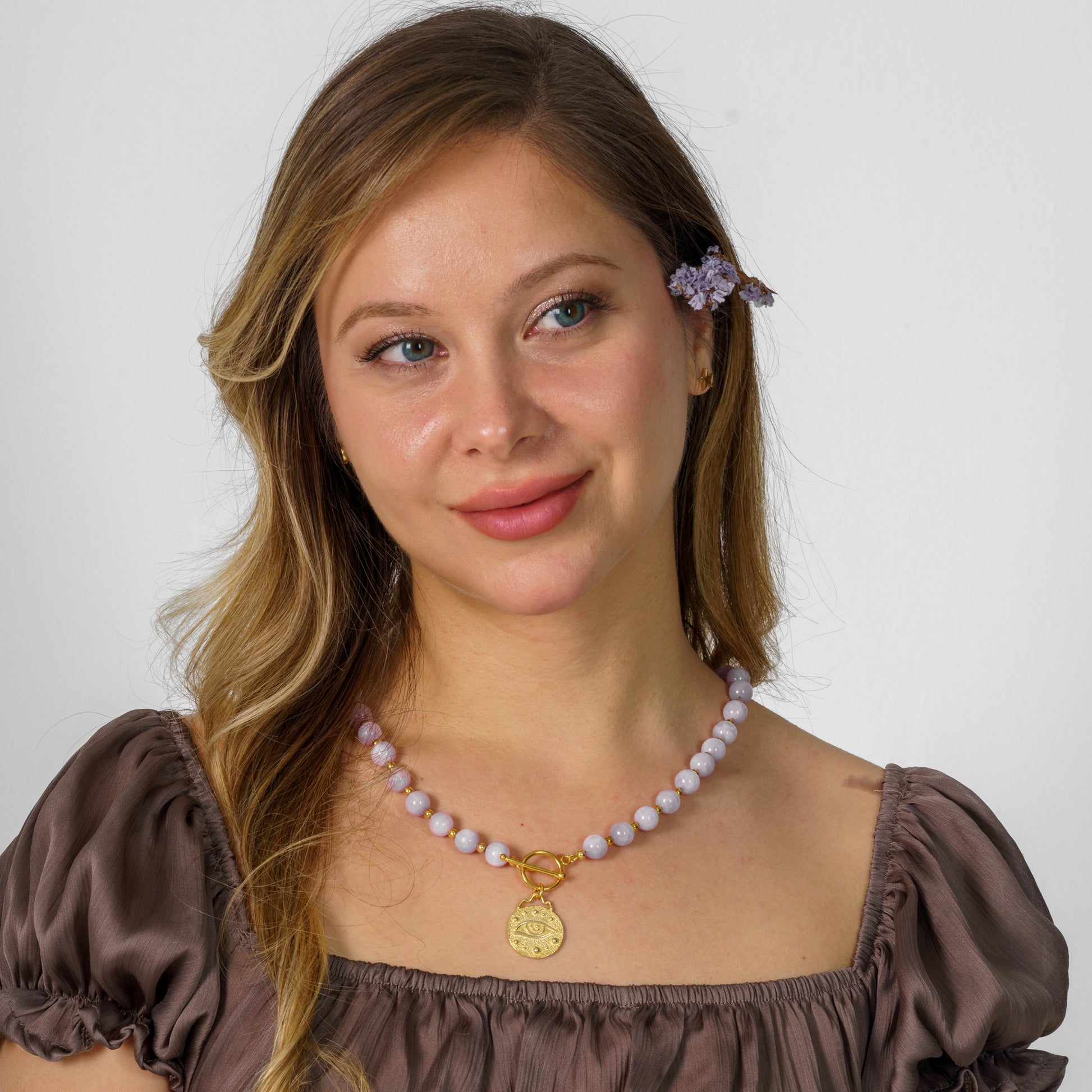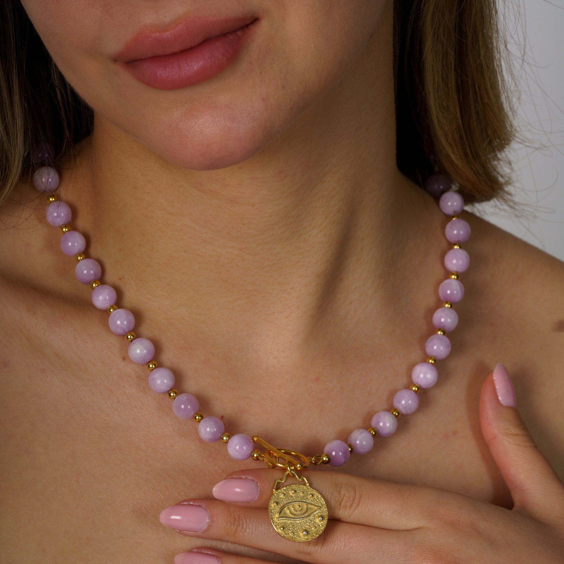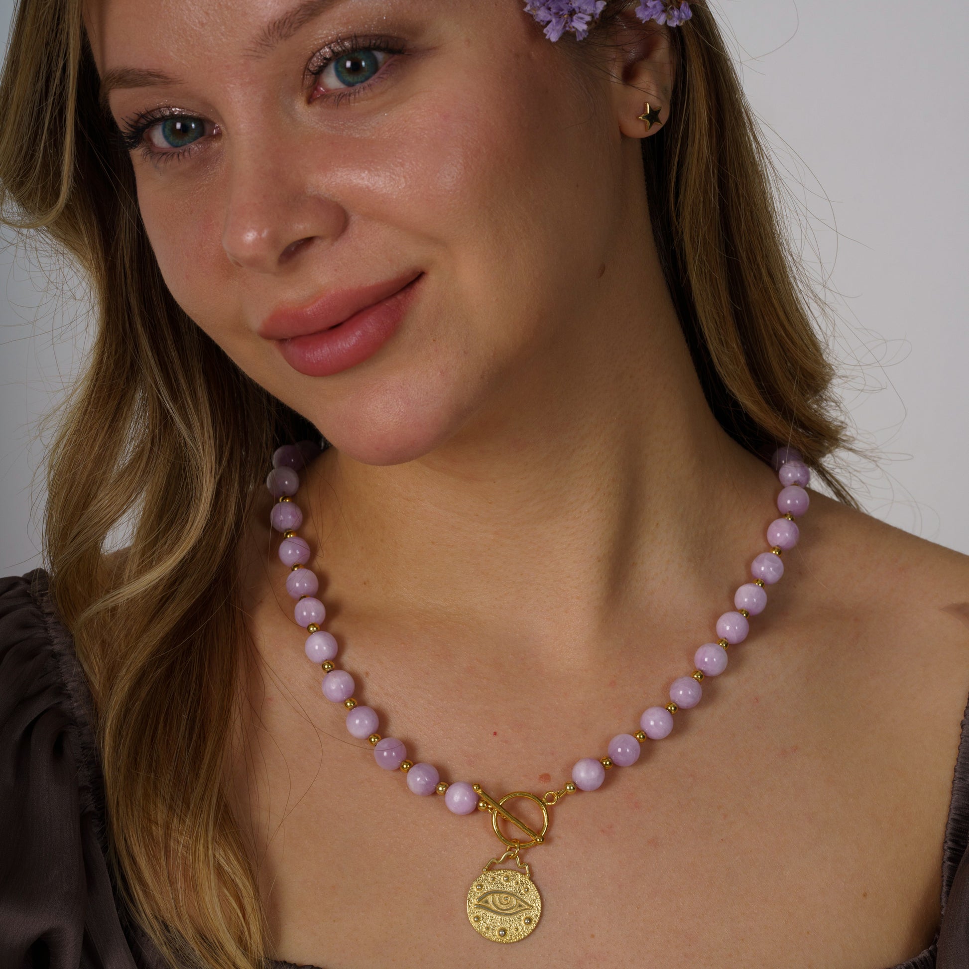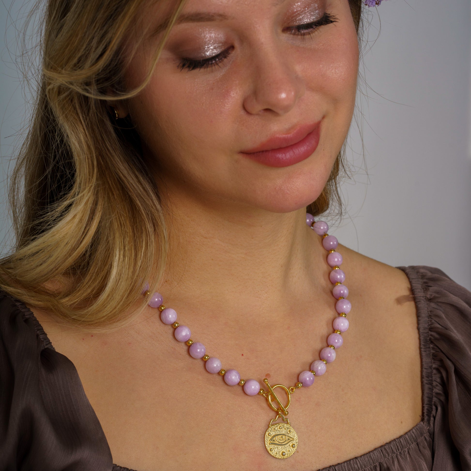 Kunzite Gemstone Necklace with Silver Eye Pendant