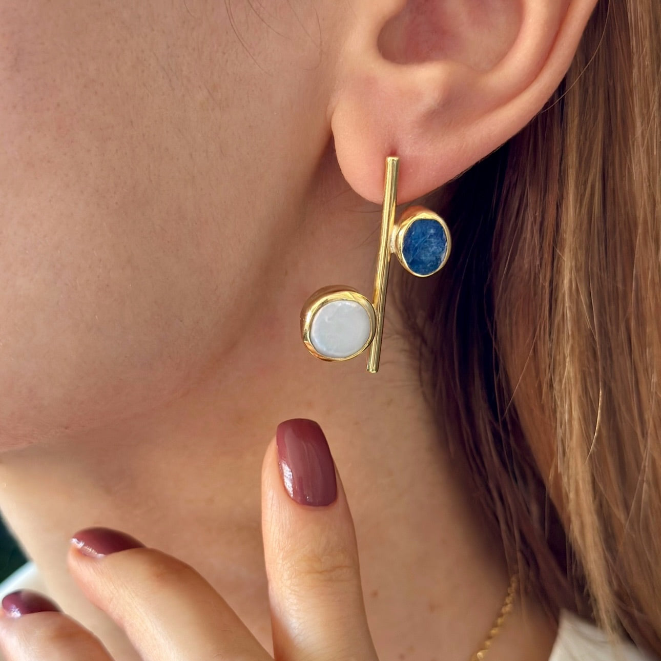 This elegant gemstone set features three coordinating pieces — a necklace, earrings, and ring — each handmade from 925 sterling silver with gold plating. The design combines natural blue kyanite and iridescent mother of pearl, balancing vibrant colour and soft luminosity in a modern, sculptural form.