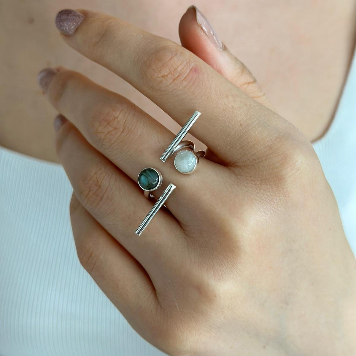 Immerse yourself in the enchanting beauty of our Handcrafted Labradorite and Moonstone Silver Ring. This unique ring showcases a seamless combination of the ethereal moonstone and the mysteriously captivating labradorite, brought together in a stunning design. Perfectly complemented by the brilliance of sterling silver, this ring exudes an air of sophistication and elegance.