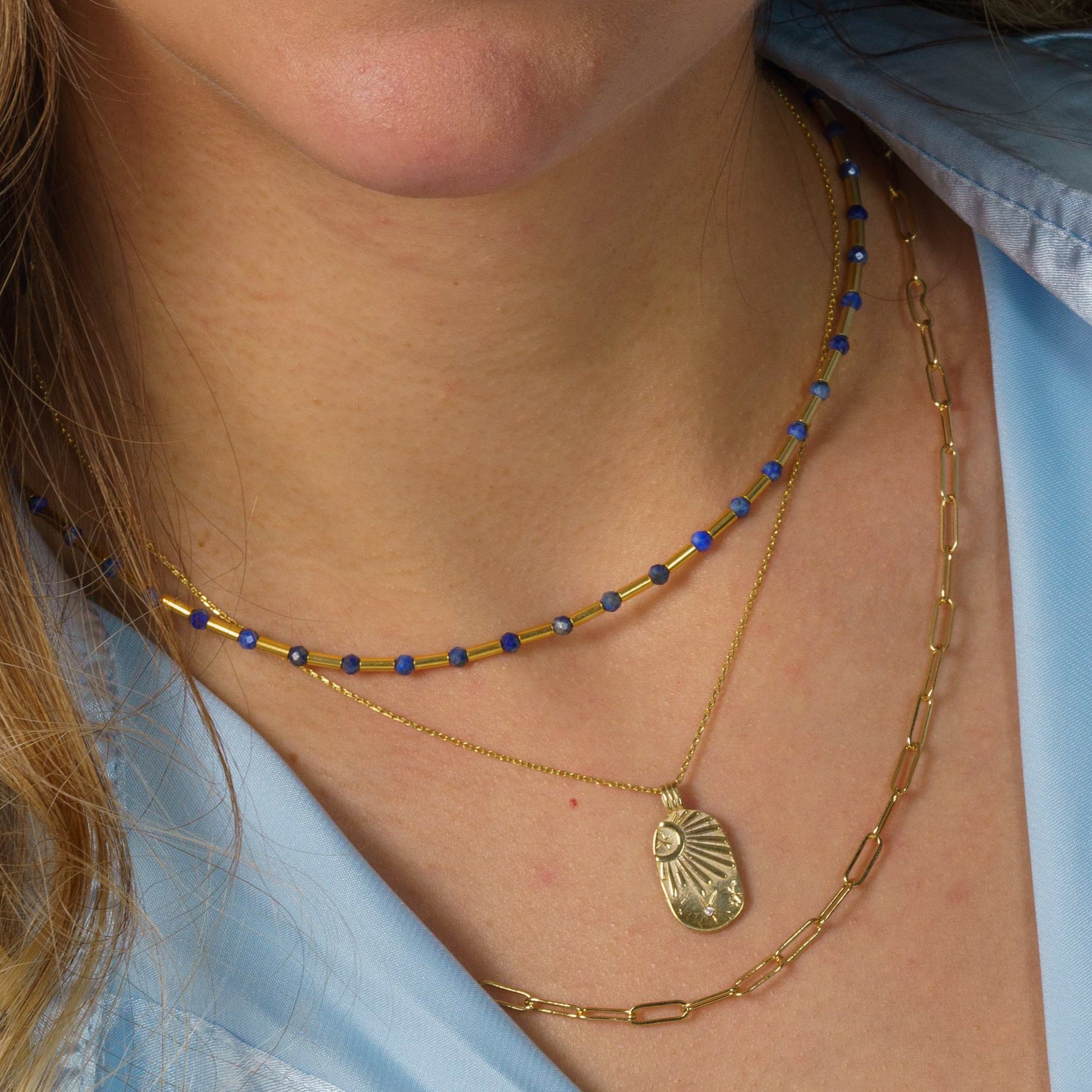 Step into summer with our stunning Lapis Lazuli and 925 Sterling Silver Gold-Plated Necklace, a handmade treasure that captures the essence of sunny beaches and holiday bliss. Crafted to order, this piece is the epitome of summer jewellery, perfect for warm days and balmy nights. Its timeless design reflects the beauty and charm of the season, making it an ideal choice for holiday jewellery. The necklace boasts genuine lapis lazuli gemstones, known for their captivating deep-blue colour reminiscent of the sea. These stones symbolise wisdom and truth, adding depth to any summer wardrobe. Set against the luxurious backdrop of gold-plated 925 sterling silver, this necklace gleams like sunlight dancing on the waves. Meticulously assembled, each element enhances the durable yet elegant nature of this unique holiday accessory. Adjustable for the perfect fit, this choker-length necklace is a versatile piece for summer styling. It features a convenient lobster claw closure for easy wear, ensuring it stays securely fastened during summer adventures. Ideal for pairing with other accessories, it offers endless possibilities for layering and complementing your favourite summer outfits. This handcrafted necklace isn't just jewellery; it's a summer statement. Whether treating yourself or finding a thoughtful gift for someone special, this piece promises to bring joy and beauty to any occasion. Its blend of classic and contemporary design means it's the perfect necklace for making a subtle statement or dressing up any casual summer evening.