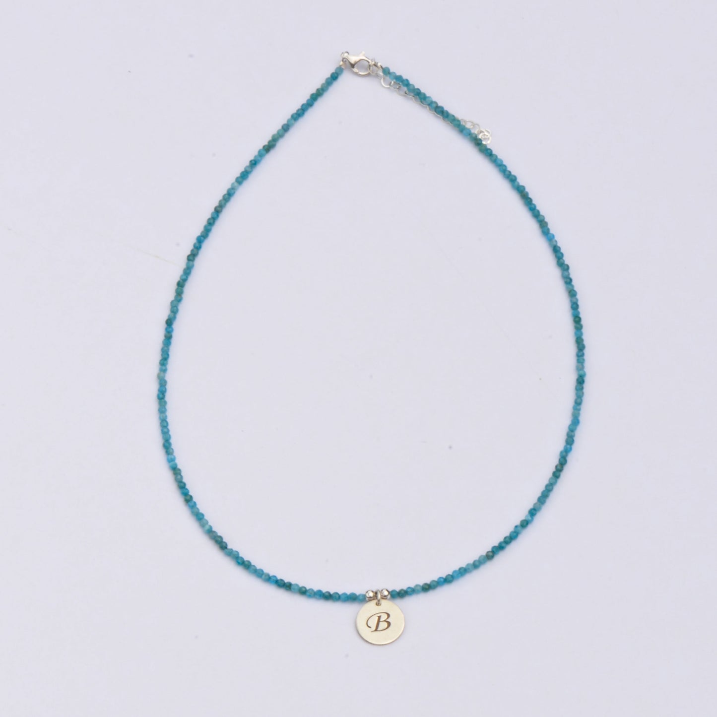 Welcome the radiant days and balmy nights of summer with our exquisite 925 Sterling Silver Apatite Necklace. Handmade to order, this piece is infused with the lively spirit of holiday jewellery and the vibrant, refreshing allure of natural apatite beads. Perfect for adding a splash of colour to your summer jewellery collection, this necklace speaks to those sunny beach outings and relaxed evening dinners by the water. Let its luminous design narrate your summer stories and personal connections shared under the sun. Every detail of this necklace showcases thoughtfully curated elements, from the adjustable sterling silver chain to the captivating hues of the apatite gemstones. Adorned with a custom initial engraving, each necklace becomes a unique statement piece, seamlessly transitioning from a casual day at the beach to an elegant soirée. As warm as a golden sunset, this necklace shines as the perfect holiday jewellery choice for any outfit or occasion. Crafted for comfort and ease, the adjustable chain length (40 cm to 44 cm) ensures a flattering fit for every sun-soaked adventure. The secure lobster clasp not only adds practicality but guarantees that the necklace stays with you through all your summer escapades. Alongside its modern aesthetic are undertones of classic elegance, echoing the warmth and clarity of cherished summertime memories. Whether treating yourself to a piece of summer bliss or gifting a loved one, this necklace transcends ordinary with its heartfelt beauty and sentiment. It invites versatility whether worn solo or layered for a bolder summer statement, symbolising the connections and experiences that make your summer unforgettable. Embrace this necklace not as mere jewellery, but as a summer staple that celebrates the joy and lightness of the season.
