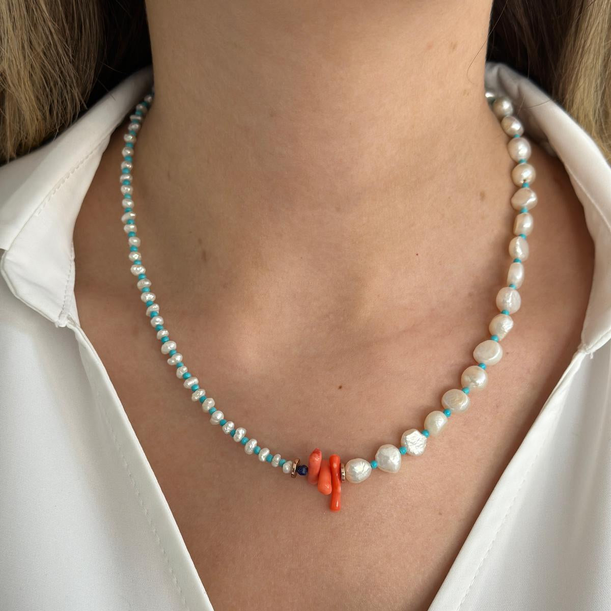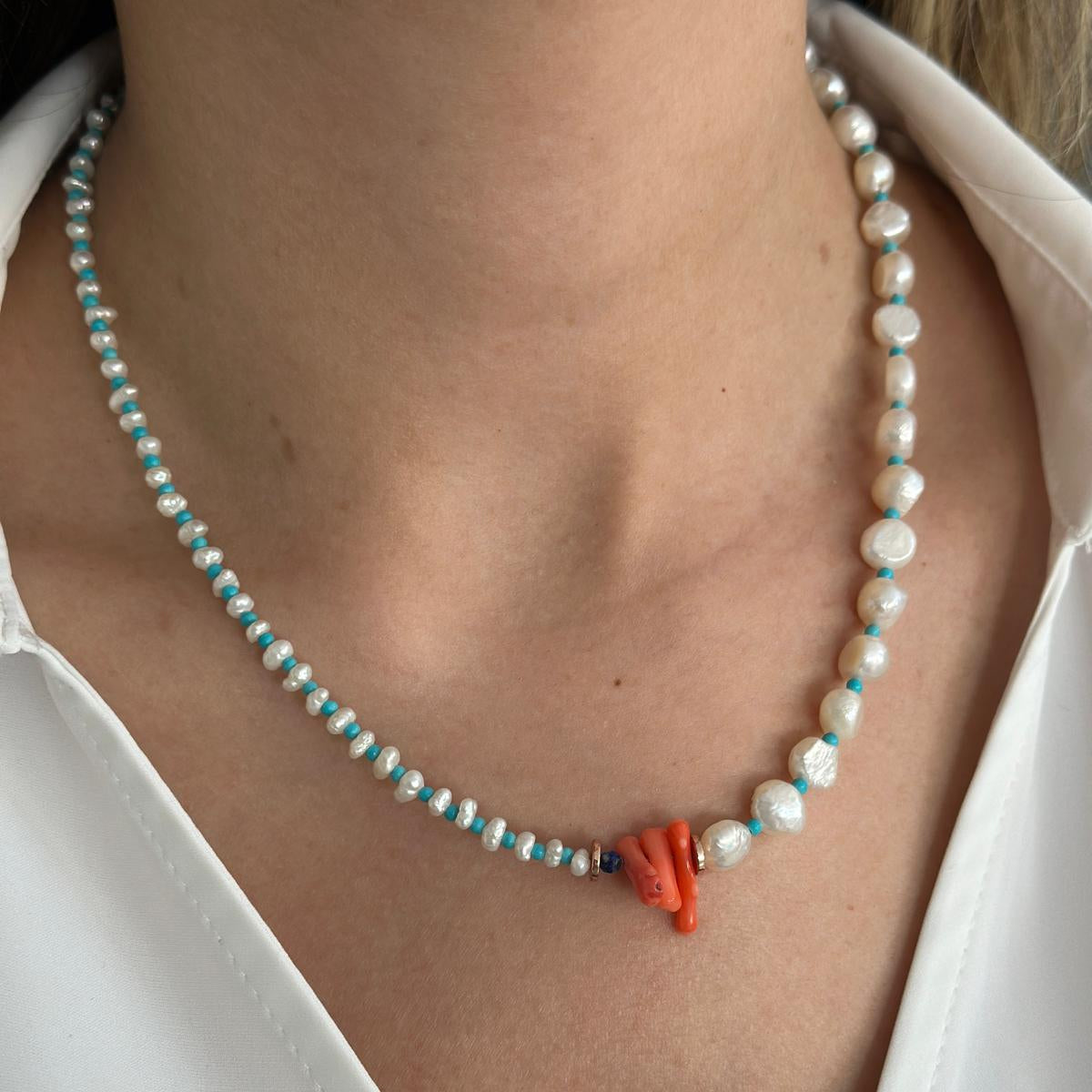 Immerse yourself in the graceful beauty of our Maya Pearl and Coral Gemstone Necklace. Crafted with a thoughtful blend of natural gemstones, this piece is a perfect balance of elegance and charm, featuring a lustrous array of natural pearls, coral, sodalite, and howlite stones. Each element is set in premium rose gold-plated 925 sterling silver, ensuring its timeless appeal and quality craftsmanship.