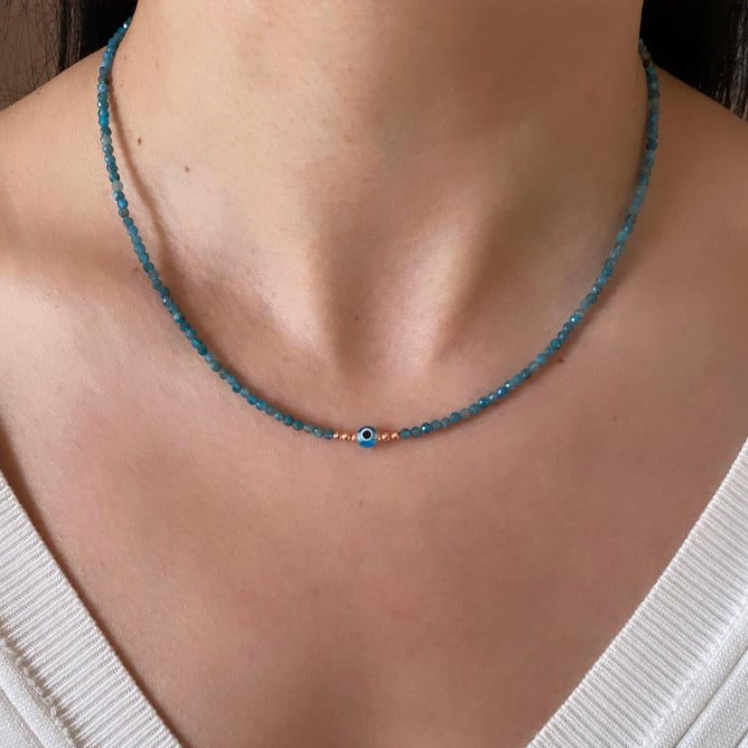 Immerse yourself in the beauty of summer with our handmade Minimalist Mini Evil Eye Apatite Gemstone Necklace. This elegant piece is designed to capture the essence of sun-soaked holidays and warm beach days. Crafted in 925 Sterling Silver with a rose gold finish, the necklace features a captivating Apatite gemstone, known for sparking creativity and clarity. Each necklace is made to order, ensuring a personalised touch that stands out in any summer jewellery collection. The Apatite gemstone, with its tranquil blue hues, mirrors the calming waves of a summer beach, enhancing your holiday wardrobe effortlessly. More than just an accessory, this necklace symbolises personal growth and the spirit of adventure, inspiring you to reach new goals during your summer escapades. Artisanal craftsmanship ensures each piece is unique, promising durability and a timeless style that complements any summer outfit beautifully. Perfect for warm evenings at beachside cafes or sunny days in coastal towns, this necklace is a versatile addition to your summer jewellery repertoire. Wear it solo or layer with other pieces to create your own beach-inspired look. Its adjustable 40 cm chain with a 4 cm extension provides a comfortable fit, and the lobster claw clasp ensures it stays secure, no matter how active your holiday adventures. Packaged in a charming pink box or a pink velvet pouch, it’s perfect for gifting, making it an ideal choice for birthdays or as a special treat to yourself. Whether you're jetting off to a tropical paradise or enjoying a staycation in the sun, this necklace brings a touch of the sea breeze and luxury to your summer days.