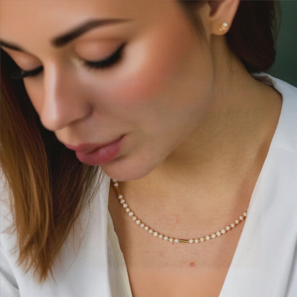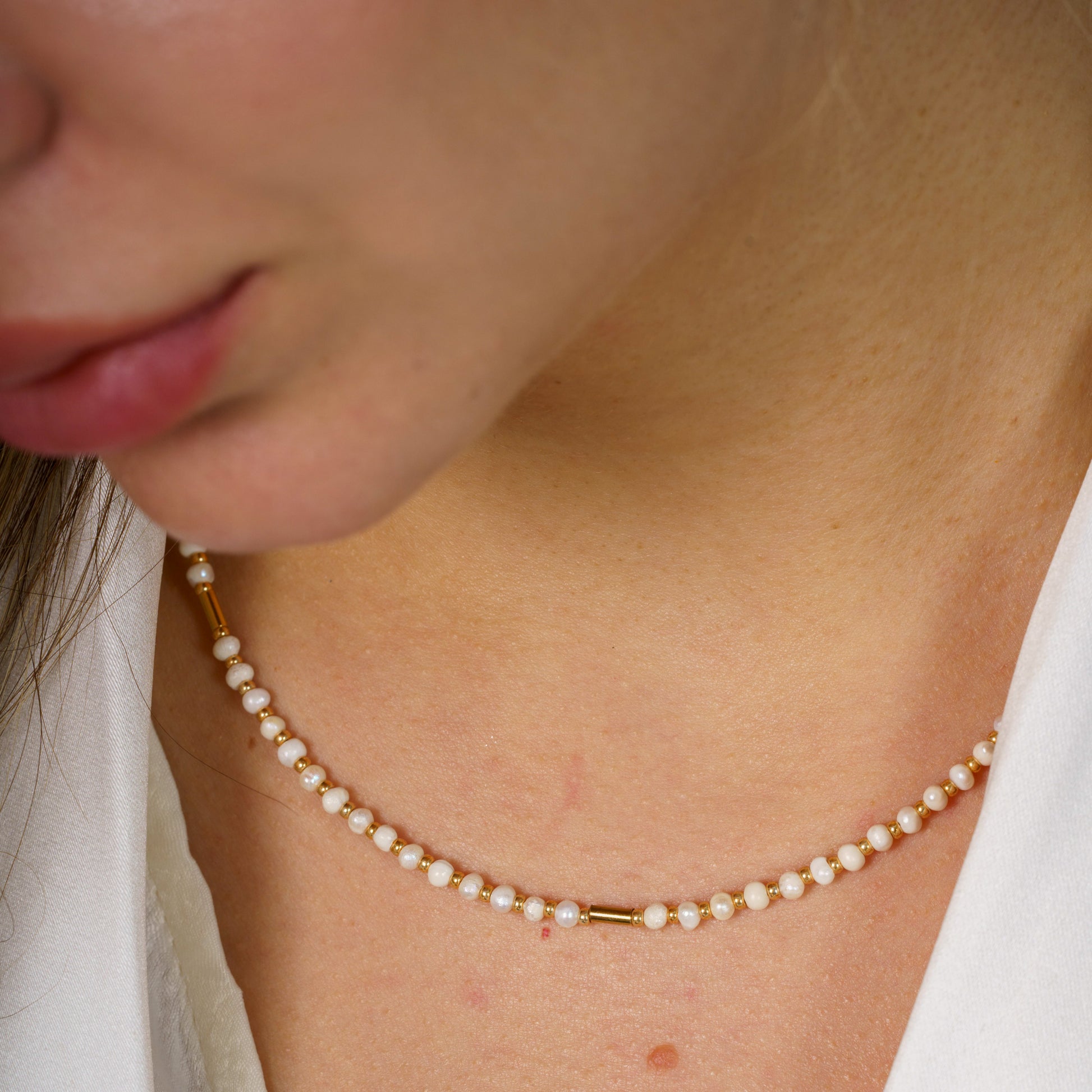 Embrace the essence of summer with our Minimalist Freshwater Pearl Necklace, a radiant piece crafted in gold-plated sterling silver, perfect for sun-soaked holidays. This necklace captures the natural allure of freshwater pearls in a minimalist design, bringing a touch of elegance to any warm-weather outfit. Comfortable and chic, it's an ideal accessory for beach days and balmy summer nights. Every detail of this necklace has been thoughtfully designed for your ultimate comfort and style. The 40 cm chain, with a 4 cm adjustable extension, ensures a perfect fit and sits delicately against sun-kissed skin. The durable lobster claw clasp provides secure and carefree wear, while the gold-plated surface reflects the warmth of sunny days, making it a stunning piece whether worn alone or layered with other summer jewellery. This necklace will be a cherished keepsake, embodying grace and sophistication through every seaside escape and holiday adventure. It's the perfect accessory to add a touch of elegance to your summer wardrobe or a meaningful token of appreciation for yourself or someone special. Whether exploring new destinations or enjoying a garden party, this necklace brings timeless charm to summer memories. Ideal for summer gift-giving, this necklace offers versatility for birthdays, anniversaries, or just because you or someone you love deserves a little sparkle during the season of sunshine. Its minimalist and elegant design makes it a delightful addition to any summer jewellery collection, seamlessly blending with both casual and formal holiday looks.