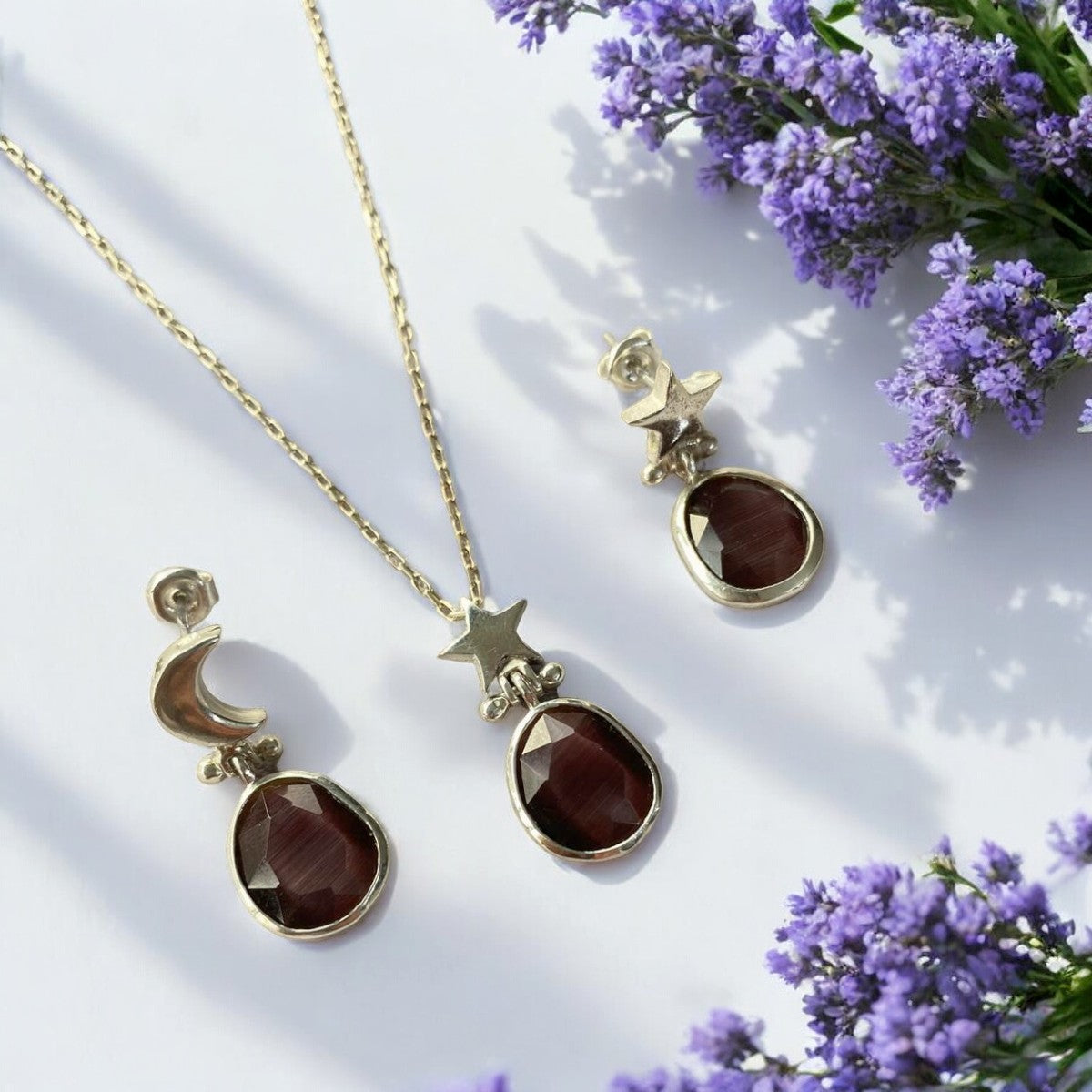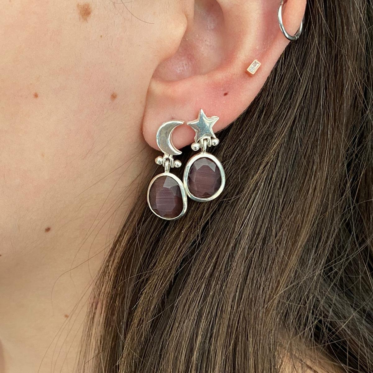 Dive into the warmth of summer with the exquisite Handmade Silver Moon and Star Necklace & Earrings Set, a touch of coastal elegance you can enjoy on sunlit holidays. Designed with 925 sterling silver, this radiant set features intricate moon and star motifs, perfectly harmonising the shimmering charm of celestial nights and the vibrant hues of dark purple and cat's eye stones. It's summer jewellery that captures the essence of warm evenings and ocean breezes, making it an unforgettable keepsake. Handmade to order, this unique jewellery set captures the leisurely flow of summer days. The adjustable necklace chain and spring ring clasp ensure a perfect fit while showcasing your holiday style with grace. Whether exploring beachside towns or enjoying seaside dinners, this set's simplicity echoes the timeless beauty of the season. Transition effortlessly from a sunny day of exploration to a chic evening out. Pair it with your favourite summer dress for a relaxed yet elegant look that suits any summer night occasion. The moon and star designs add a touch of mystery and wonder, fitting seamlessly into both casual and refined wardrobes. It's the perfect holiday jewellery piece that celebrates summer's laid-back yet elegant vibe. Unleash your inner star with this enticing Handmade Silver Moon and Star Purple Necklace & Earrings Set. Its unique sparkle and simplicity make it a cherished addition to any summer-loving wardrobe. Whether on a warm getaway or enjoying a peaceful summer evening at home, this jewellery set serves as a constant reminder of those cherished warm weather memories.