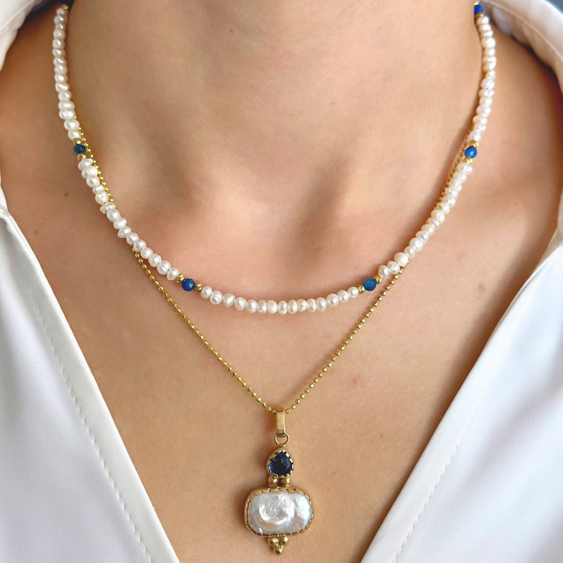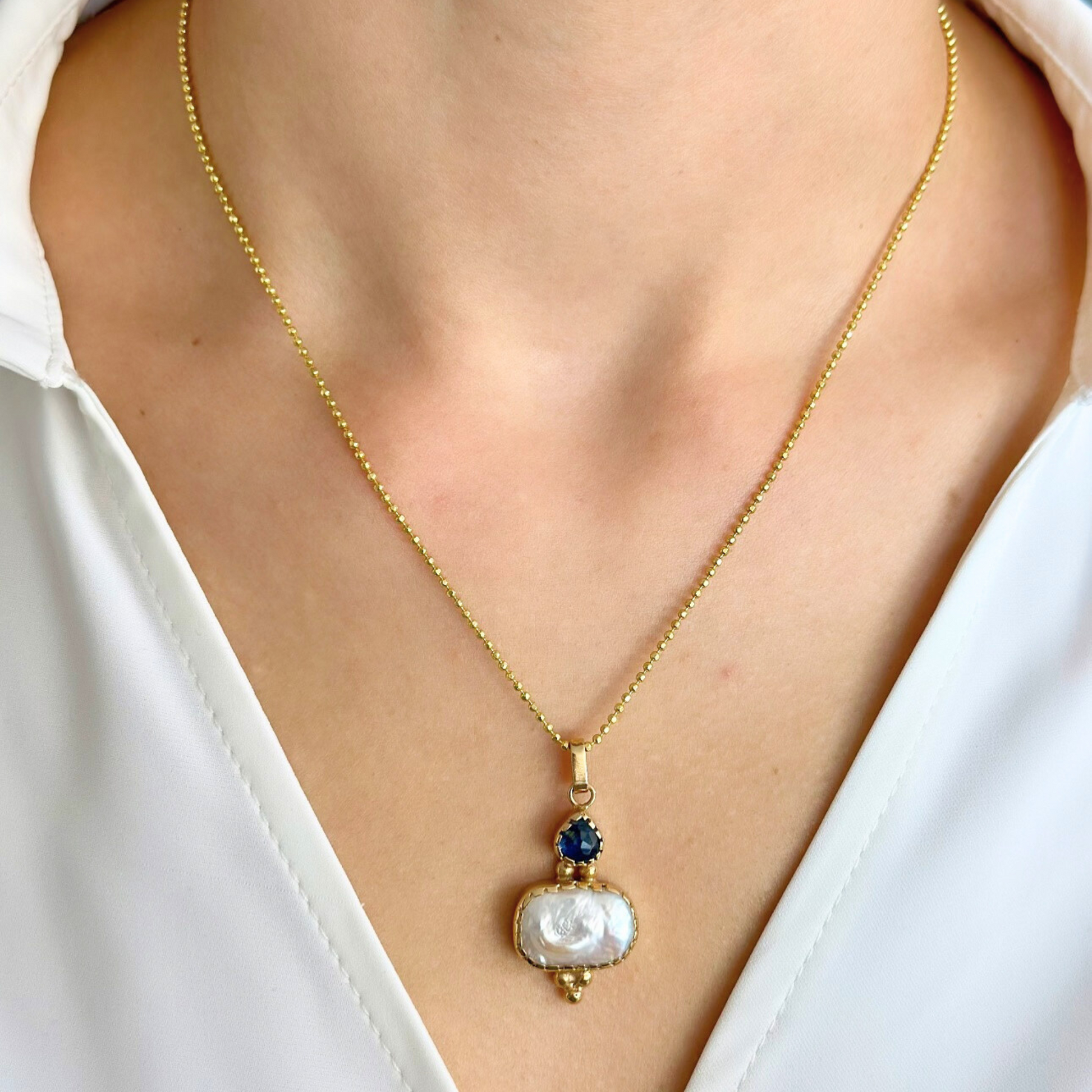 The Pearl and Kyanite Pendant Chain Necklace is versatile and can be worn as a standalone statement piece or layered with other necklaces for a trendier look. Its handcrafted design ensures exceptional attention to detail, resulting in a piece that feels uniquely yours. Celebrate elegance and sophistication with this gorgeous piece of jewellery that resonates with a touch of individuality.