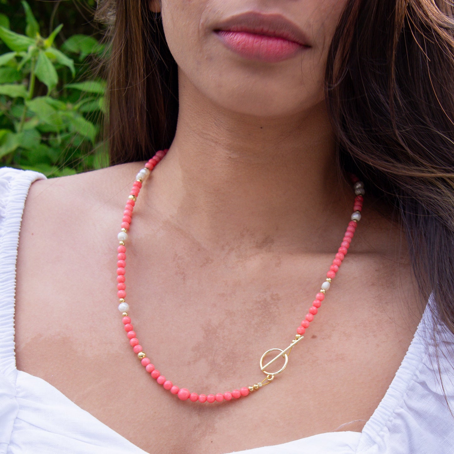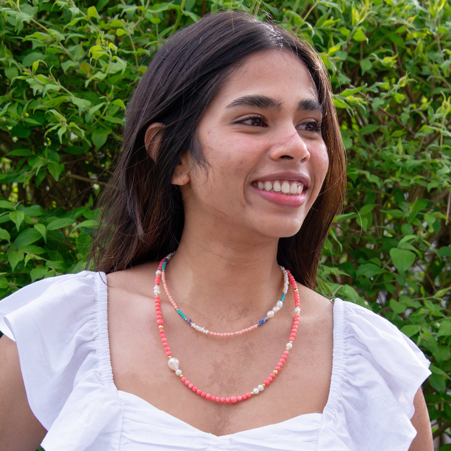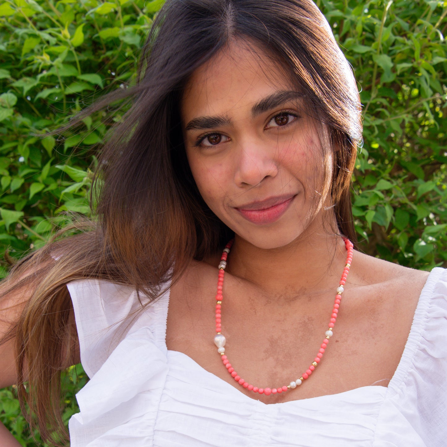 Step into the spirit of summer with our stunning Handmade Pink Coral Necklace. This piece is a true summer delight, perfect as a gift or for adding a touch of elegance to your holiday look. The necklace blends the warmth of pink coral beads with the timeless beauty of freshwater pearls, all complemented by 14K gold plated silver for a luxurious finish. It’s a perfect companion for those breezy summer nights and sunlit days at the beach. Crafted with care and a passion for quality, each necklace features baroque freshwater pearls that blend beautifully with pink coral, creating an understated seaside charm. The secure, easy-to-use toggle clasp and 50cm chain ensure it rests perfectly against your summer dress or casual holiday attire. Whether you're enjoying a sunny day out or a relaxed evening by the ocean, this necklace adds effortless style to any outfit. The 14K gold plated sterling silver findings provide both durability and sophistication, embodying a fresh, summery twist on classic jewellery. Ideal for gifting, it makes a memorable present for summer birthdays, anniversaries, or simply as a unique way to celebrate your summer adventure. The unique combination of textures and colours ensures this accessory becomes a favourite, perfect for making any summer occasion more special. This necklace is not only a stylish addition but also easy to maintain. Its beauty can be preserved for years by storing it dry and avoiding contact with cosmetic chemicals. Whether worn on a sun-drenched holiday or a simple day out, this exquisite piece captures the essence of summer, elegance, and love. Order yours today and get ready to add a splash of summer to your jewellery collection—it ships within 2 weeks and promises to arrive just in time for your next sun-kissed getaway!
