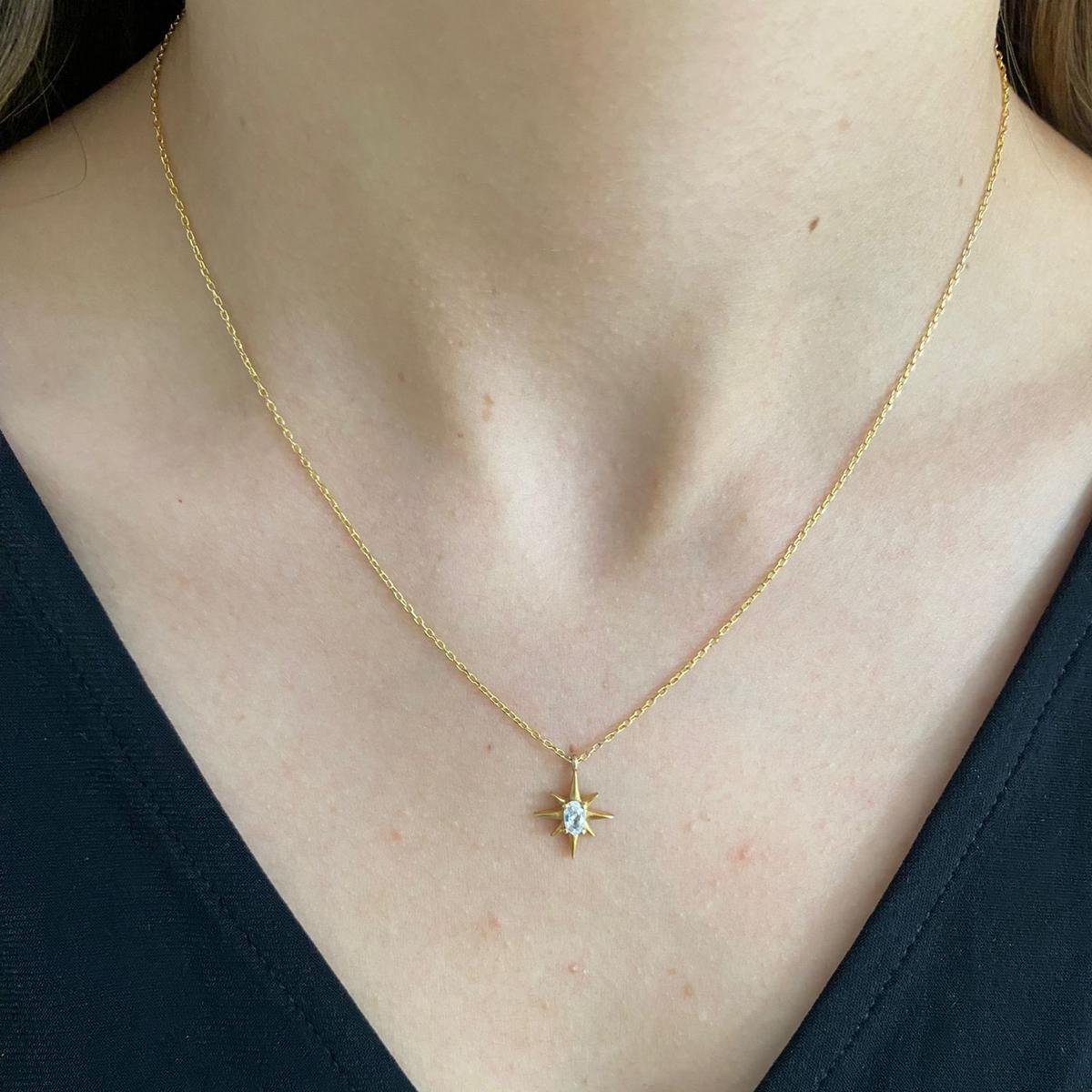 Dream of sunlit beaches and warm summer nights with our Sterling Silver North Star Necklace. This exquisite piece of summer jewellery captures the magic of balmy nights under clear skies. The pendant, beautifully crafted with a North Star motif and a sparkling zirconium stone, is like a glimmering beacon leading the way on your summer escapades. Whether you're on a beach holiday or enjoying a warm evening out, this necklace is a perfect companion to highlight all your summer adventures. Made from premium 925 sterling silver and accented with radiant 14k gold plating, this holiday jewellery promises both quality and comfort. Its adjustable 45cm chain ensures the perfect fit, so you can effortlessly style it with both casual and elegant outfits. Thanks to its hypoallergenic material, it's perfect for sensitive summer skin, making it the ideal summer necklace for long days outdoors under the sun. This necklace is not just an accessory; it's a symbol of those unforgettable summer moments. Surprise someone special with this thoughtful necklace, whether it's for a birthday, anniversary, or simply to celebrate the joy of a summer day. Its North Star pendant design conveys a message of endless possibilities and new directions, turning every day into a cherished memory. Style it for any occasion—layer it with other delicate pieces for a chic holiday look or let it shine as a statement piece against a sundress at a summer party. This versatile piece promises a unique look that's essential for your summer wardrobe, ensuring you radiate elegance and charm wherever your adventures take you.