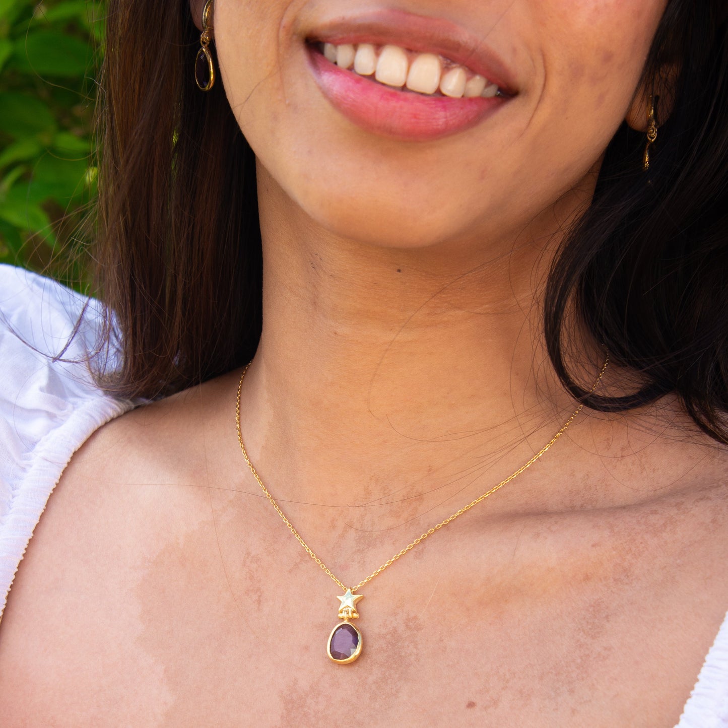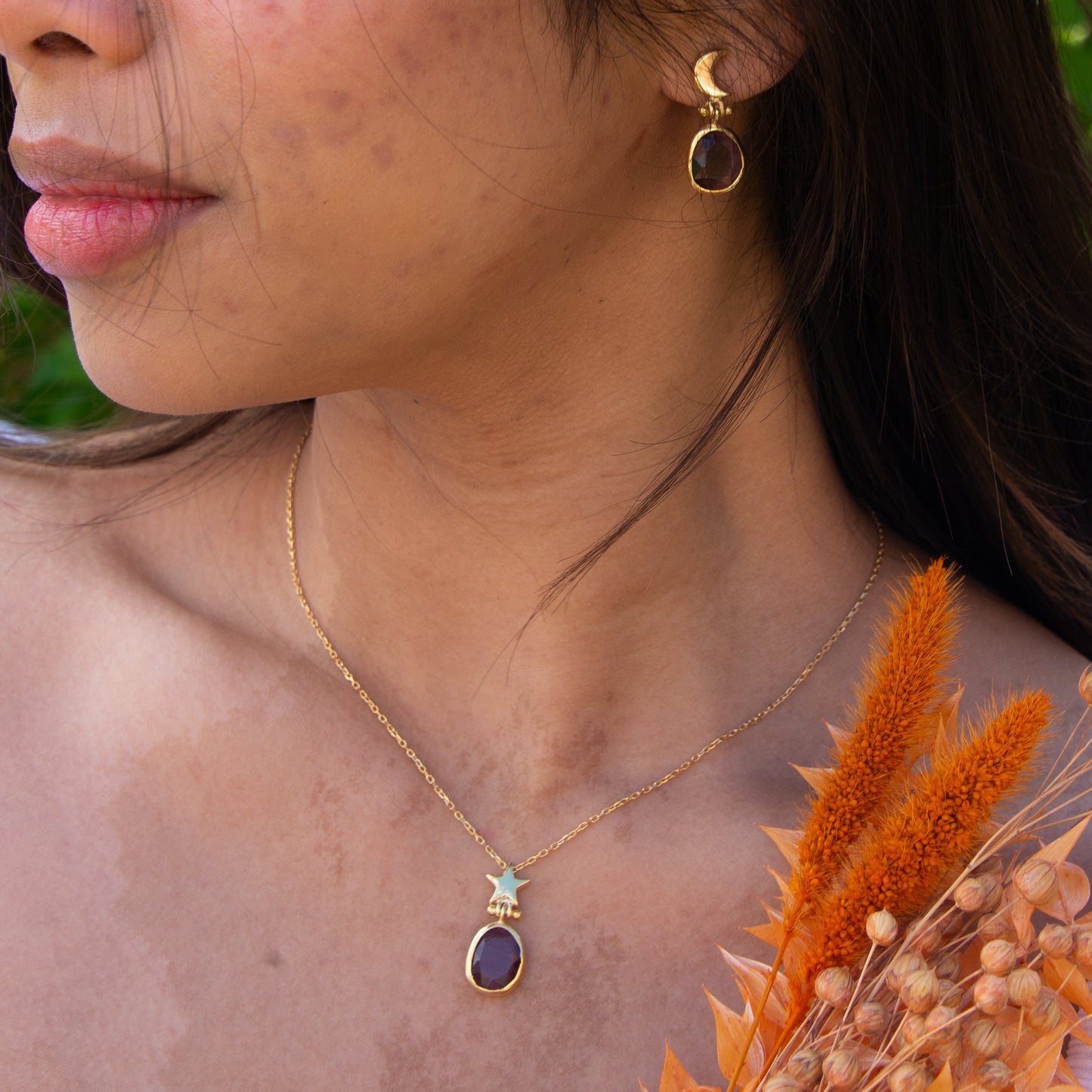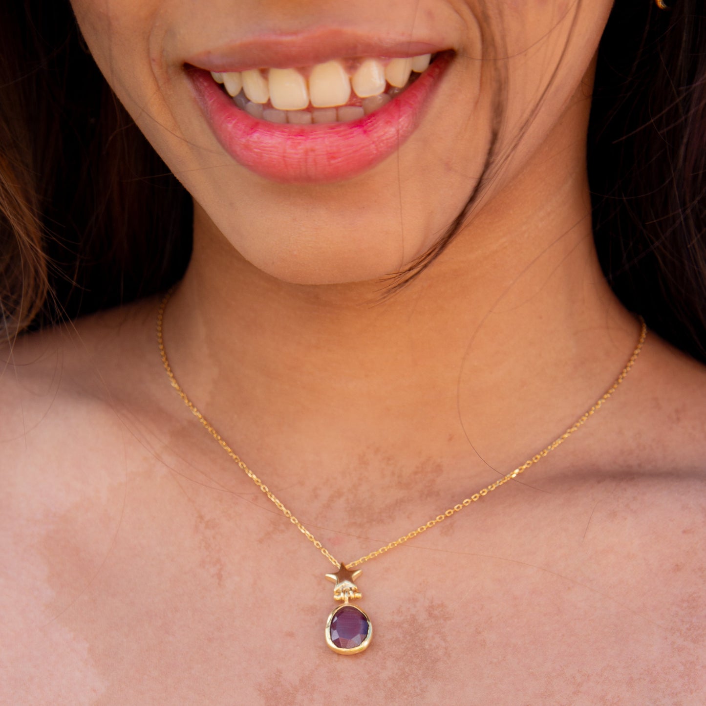 Dive into the essence of summer with our Minimalist Cat's Eye Star Pendant Necklace. This elegant jewellery piece perfectly captures the warmth and vibrancy of the holidays, merging timeless design with enduring materials. Handcrafted with care, the necklace features a unique pendant design that symbolises the radiance and strength of summer days, making it a delightful addition to any jewellery set. The star-shaped pendant is crafted from 925 sterling silver and exquisitely plated with 18K gold, emitting a warm and sunny glow. At the heart of this summer necklace lies a stunning Deep Purple Cat’s Eye gemstone, known for its captivating and mystic luster. This minimalistic yet eye-catching design ensures it complements both relaxed beachwear and breezy evening ensembles seamlessly. Gift someone special a piece of holiday spirit with this versatile summer jewellery. The adjustable chain, measuring 40cm with an extra 4cm for flexibility, ensures a comfortable fit for every neck. Equipped with a secure sterling silver lobster claw clasp, this necklace offers ease of wear, making it a reliable and cherished keepsake. Whether marking a special summer occasion, treating yourself to a holiday keepsake, or gifting summer memories to a loved one, the Minimalist Cat's Eye Star Pendant Necklace is an ideal choice. Crafted with love, detail, and skilled craftsmanship, it embodies the true essence of beauty and summer style, making it a timeless piece for any jewellery lover.