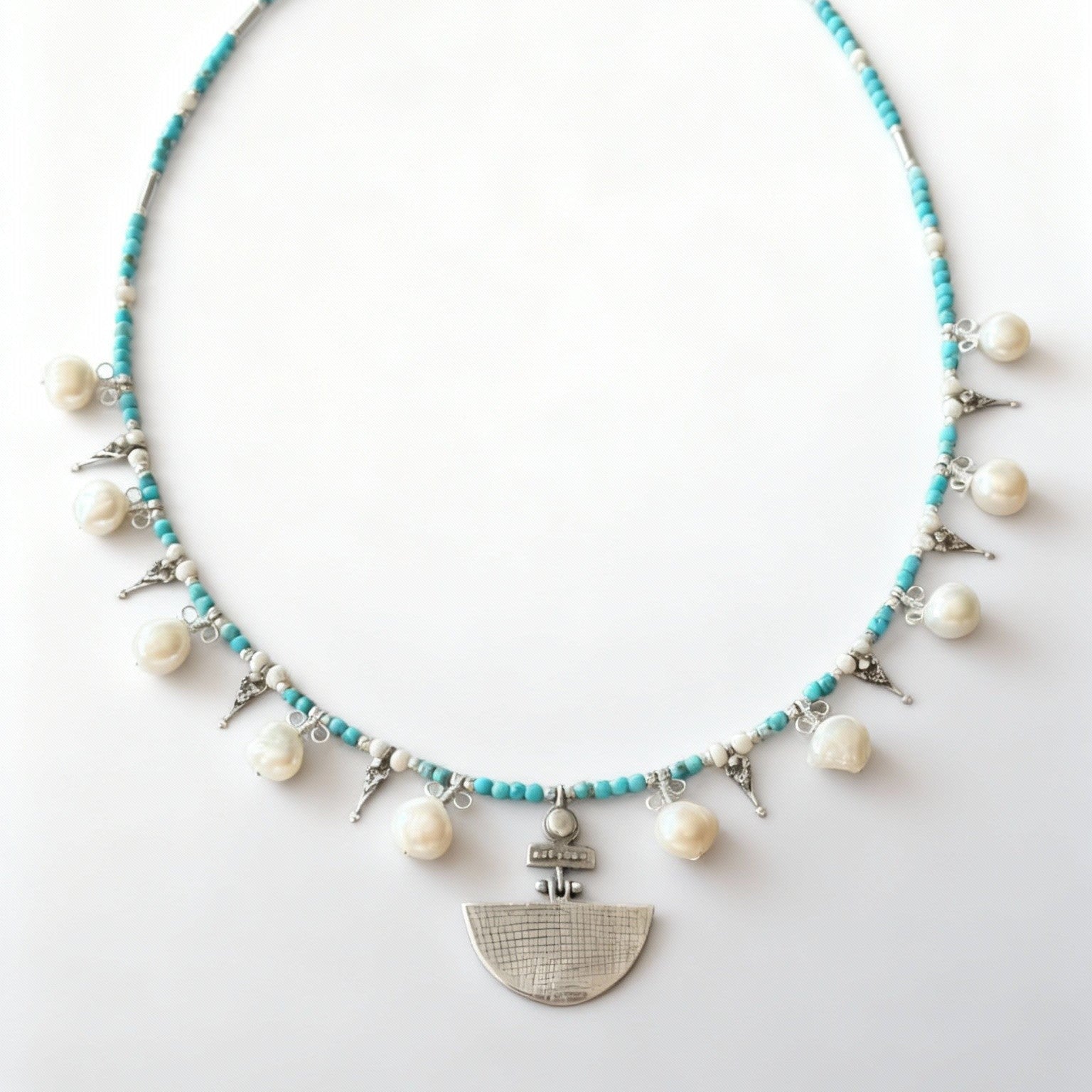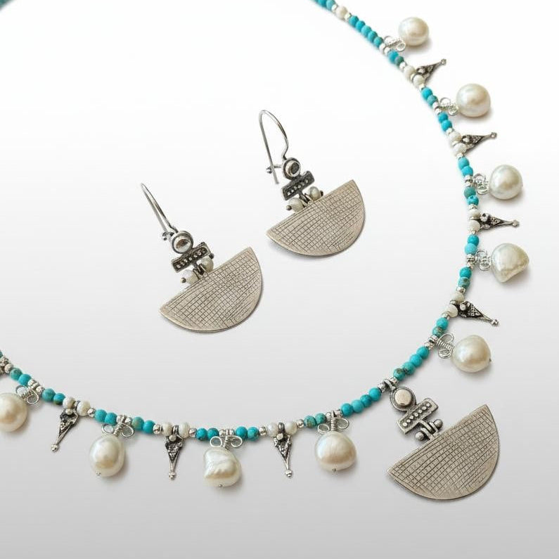 The Selena Turquoise Necklace and Earrings Set is a beautiful example of refined elegance, crafted in 925 sterling silver. This handmade jewellery set showcases genuine turquoise stones, known for their calming and soothing properties, paired with the timeless beauty of pearls. The harmonious combination of turquoise and pearls creates a gemstone set that is both stunning and meaningful, capturing the spirit of style and sentiment in one elegant piece. With a secure spring clasp and a chain length of 41 cm, plus an additional 5 cm extension, this necklace provides versatility and comfort for daily wear or special occasions. Each detail, from the silver design to the gemstone arrangement, is meticulously handcrafted, ensuring a unique piece every time. A thoughtful choice for a Christmas gift, this set not only offers beauty but also represents protection and harmony. The Selena Turquoise Necklace and Earrings Set is more than just jewellery; it is an embodiment of warmth and elegance. A wonderful addition to your holiday style, it promises to be a cherished part of any jewellery collection. Make it a treasured gift or a personal keepsake that speaks volumes about love and appreciation.
