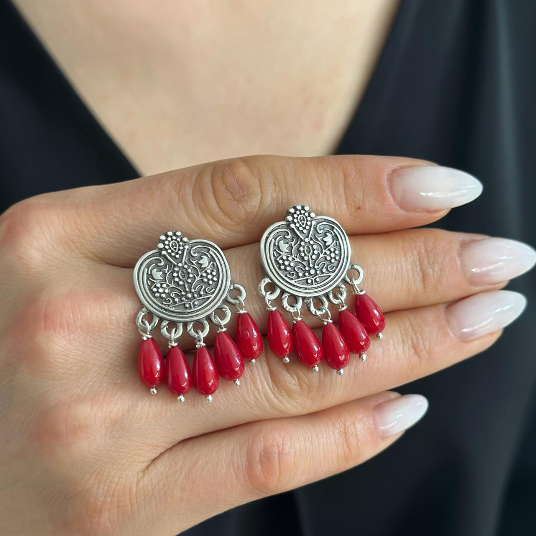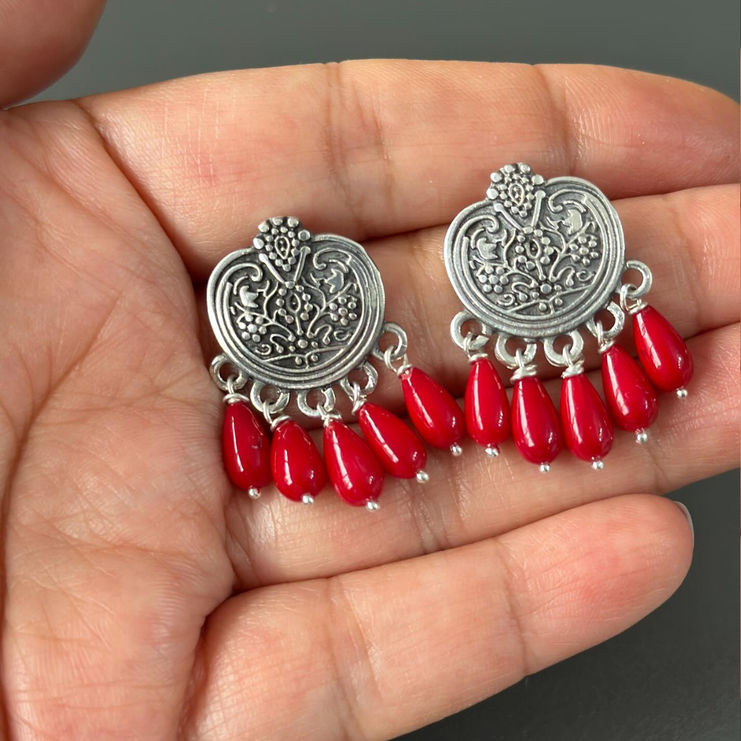 Silver Pomegranate Dangle Drop Earrings with Coral Gemstones