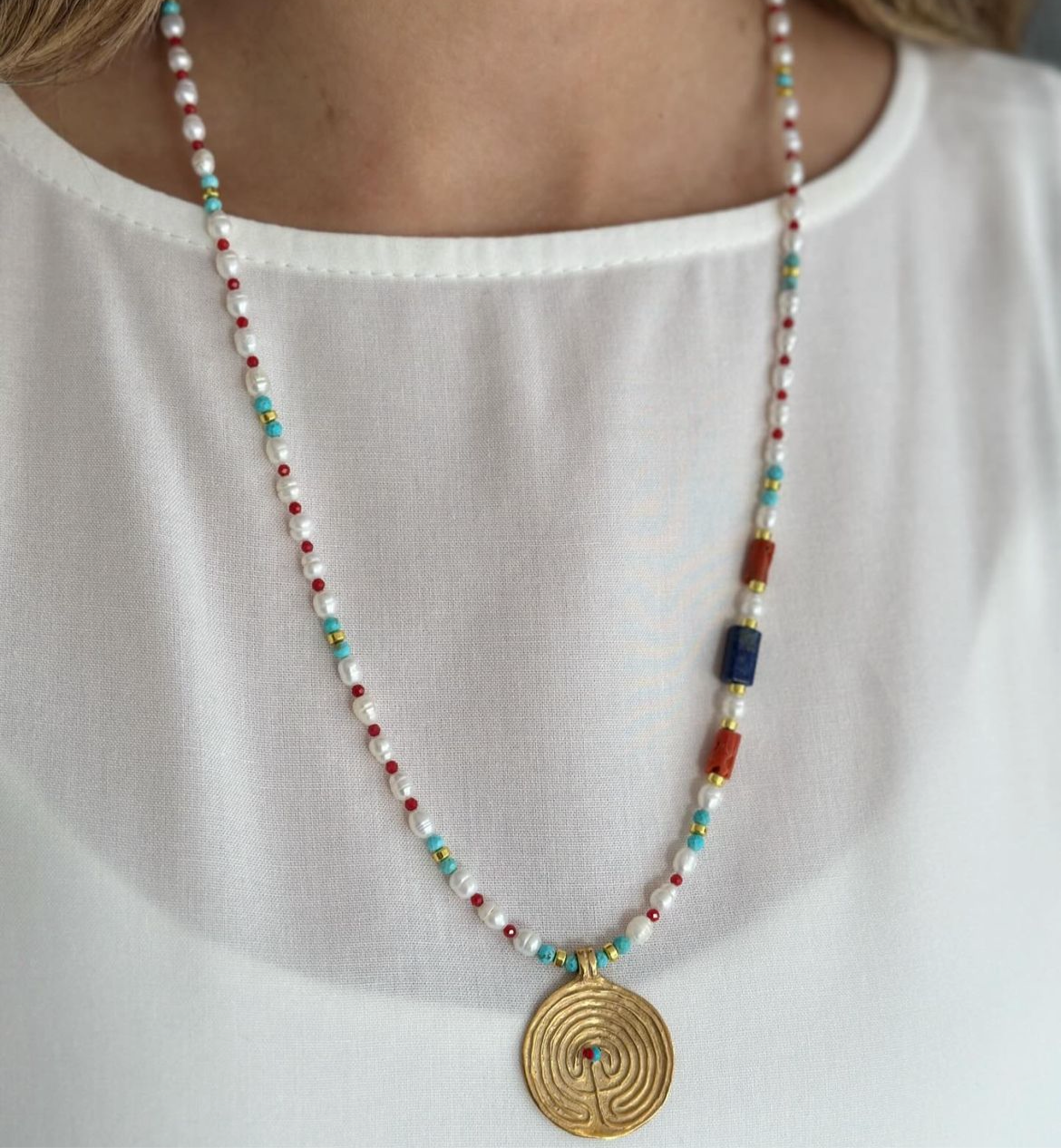 Embrace the warmth of summer with our Silver Labyrinth Pendant Necklace, an enchanting addition to your summer jewellery collection. This handcrafted piece, available to order, takes its design cues from the ancient labyrinth carvings of 6th-century Knidos in Turkey. Crafted from high-quality 925 sterling silver with elegant 14K gold-plated accents, it features natural freshwater pearls along with vibrant turquoise and lapis lazuli gemstones. This necklace is not just a striking accessory, but a piece of history and charm to wear on your sunny adventures. The labyrinth design of this necklace, symbolising pathways and personal journeys, offers the wearer a touch of serenity and inner peace amidst warm summer days and cool nights. Hypoallergenic and designed with sensitive skin in mind, it ensures comfort whether you are enjoying a relaxed beachside brunch or an evening soiree. This combination of style and spirituality makes it a standout piece for your summer travels. This unique summer necklace is the ideal holiday jewellery piece, making it a thoughtful gift for loved ones or a special treat for yourself. Its precious gemstones and intricate design make it suitable for both casual beach outings and more formal summer gatherings. Let this necklace add a splash of colour and elegance to your summer wardrobe, enhancing any outfit with its timeless appeal. Showcase elegance and emotion with this handmade necklace, crafted with a history-rich design that brings ancient artistry to life. With an adjustable length of approximately 40-50 cm, it offers versatility for different necklines and styles. Packaged and ready to ship within two weeks, this piece is a prompt gift option for anyone seeking to bring a dash of summer magic into their jewellery collection.
