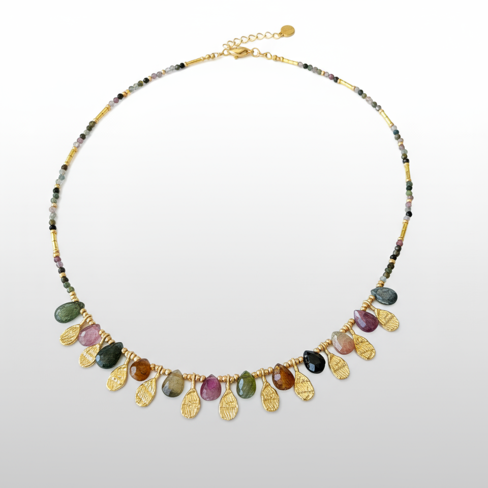 A delicate dance of colour and light — this handmade tourmaline and gold necklace celebrates individuality through a stunning array of natural gemstones. Each bead of multi-coloured tourmaline glows in unique shades of pink, green, amber, and teal, complemented by gold-plated sterling silver accents and tiny hammered gold leaf charms that shimmer with every movement.