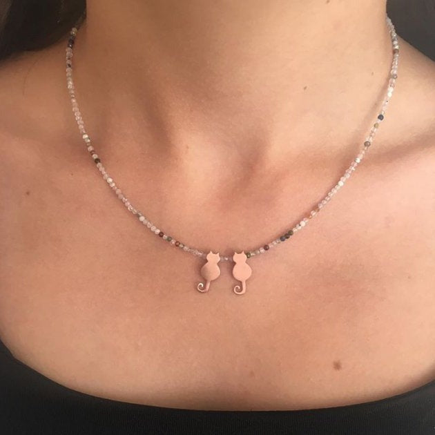 Soak up the warmth of the summer sun with our exquisite 925 Sterling Silver Double Cat Pendant Necklace, perfect for adding a touch of playfulness and sentiment to your summer jewellery collection. This unique piece beautifully captures the essence of holiday relaxation and the joyful connection with your furry companions. The intricately designed sterling silver cat pendants, paired with the vibrant, multi-coloured carnelian beads, are a celebration of life's sunny moments and bring a sense of positivity and warmth wherever you wear them. The energetic hues of carnelian beads not only enhance the necklace's appeal but also embody the revitalising spirit of summer. Known for their strengthening properties, these beads are perfect for days spent by the sea or exploring new summer adventures. Whether you gift it to a fellow cat lover or indulge yourself, this necklace is a testament to lively craftsmanship meant to accompany your summer memories and brighten any holiday outfit. With an adjustable chain length of 40 cm plus an additional 4 cm extender, you can style this necklace comfortably for any summer occasion, from a casual beach outfit to a sophisticated evening ensemble. The reliable silver lobster claw clasp ensures that your necklace stays secure, letting you enjoy your summer plans worry-free. Each detail is carefully handcrafted, reflecting the love and devotion you can carry with you right through the vibrant season. Ideal for gifting during the sunny months, this necklace embodies the spirit of summer holidays and is a thoughtful piece for anyone who cherishes time spent with pets. Its versatility makes it easy to pair with your favourite summer dresses, providing a cherished accessory for sunlit days and starlit evenings alike. Dive into the summertime joys of this necklace and celebrate the warmth of friendship, family, and furry friends.